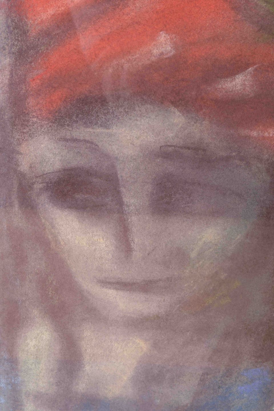 Et følsomt og drømmende portræt i dæmpede farvetoner, hvor de bløde linjer og det let slørede ansigt giver billedet en meditativ og næsten tidløs karakter. Den røde hovedbeklædning står som en varm kontrast til de kølige violette og grønne nuancer i baggrunden. Jordells arbejde med kridt fremhæver det sarte og stoflige udtryk, der giver motivet en særlig poesi.