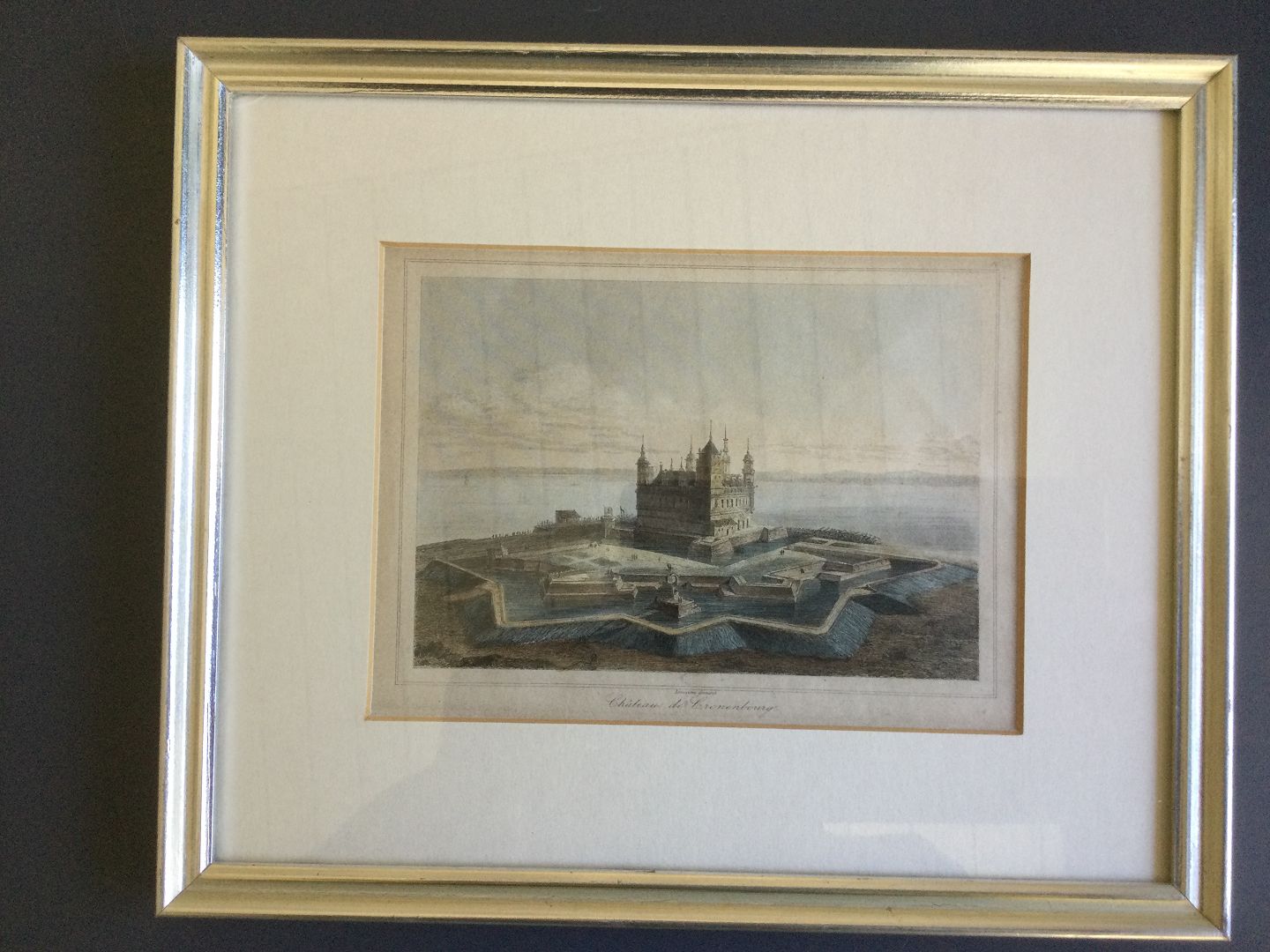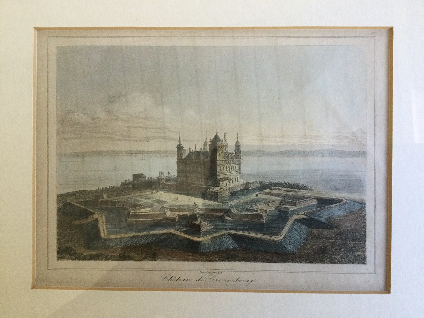 Koloreret radering ca. 1840 af Augustin-Francois Lemaitre Kronborg Slot i Helsingør.