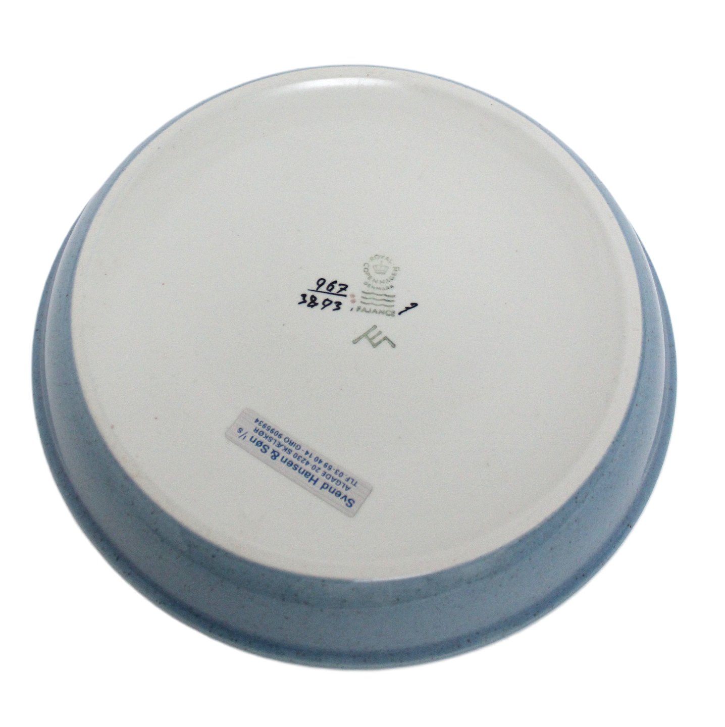 Royal Copenhagen Celeste lyseblå porcelæn med blomstermotiv, kunstner Ellen Malmer. Mellemstort rundt fad. Nr. 967/3893. Diameter 24 cm. Højde 3,5 cm. I. sortering. Pris: 325 kr.