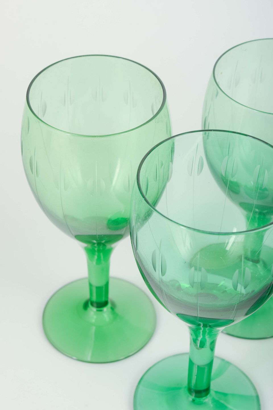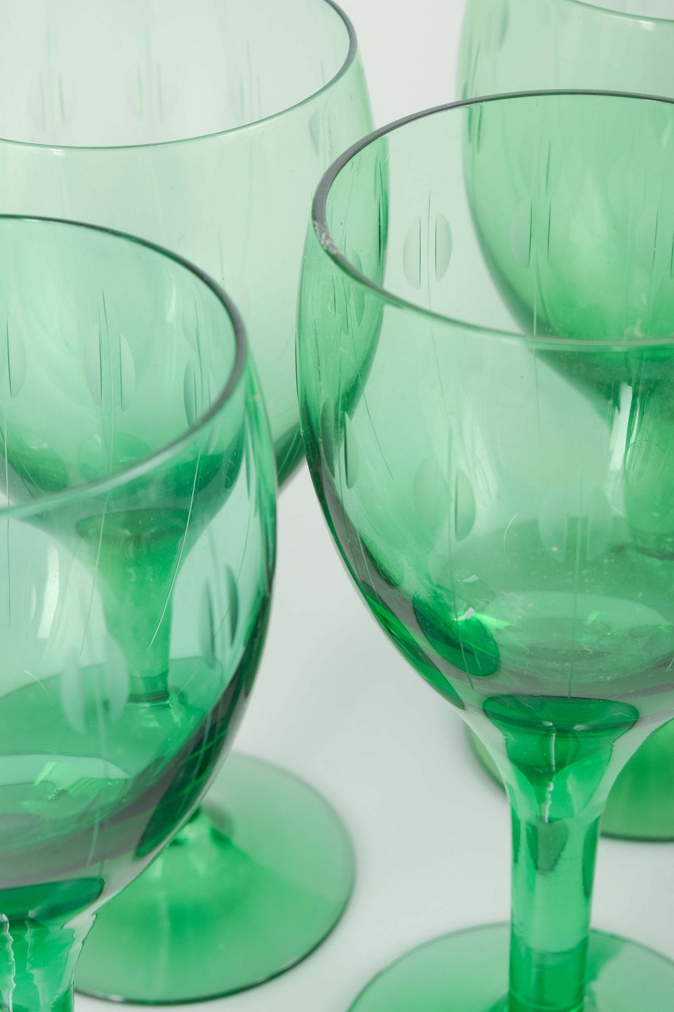 Sæt med seks grønne hvidvinsglas i det klassiske Kirsten Piil-design for Holmegaard. De elegante glas har en let organisk form og et smukt, transparent grønt farvespil, der giver et tidløst og stilrent udtryk.