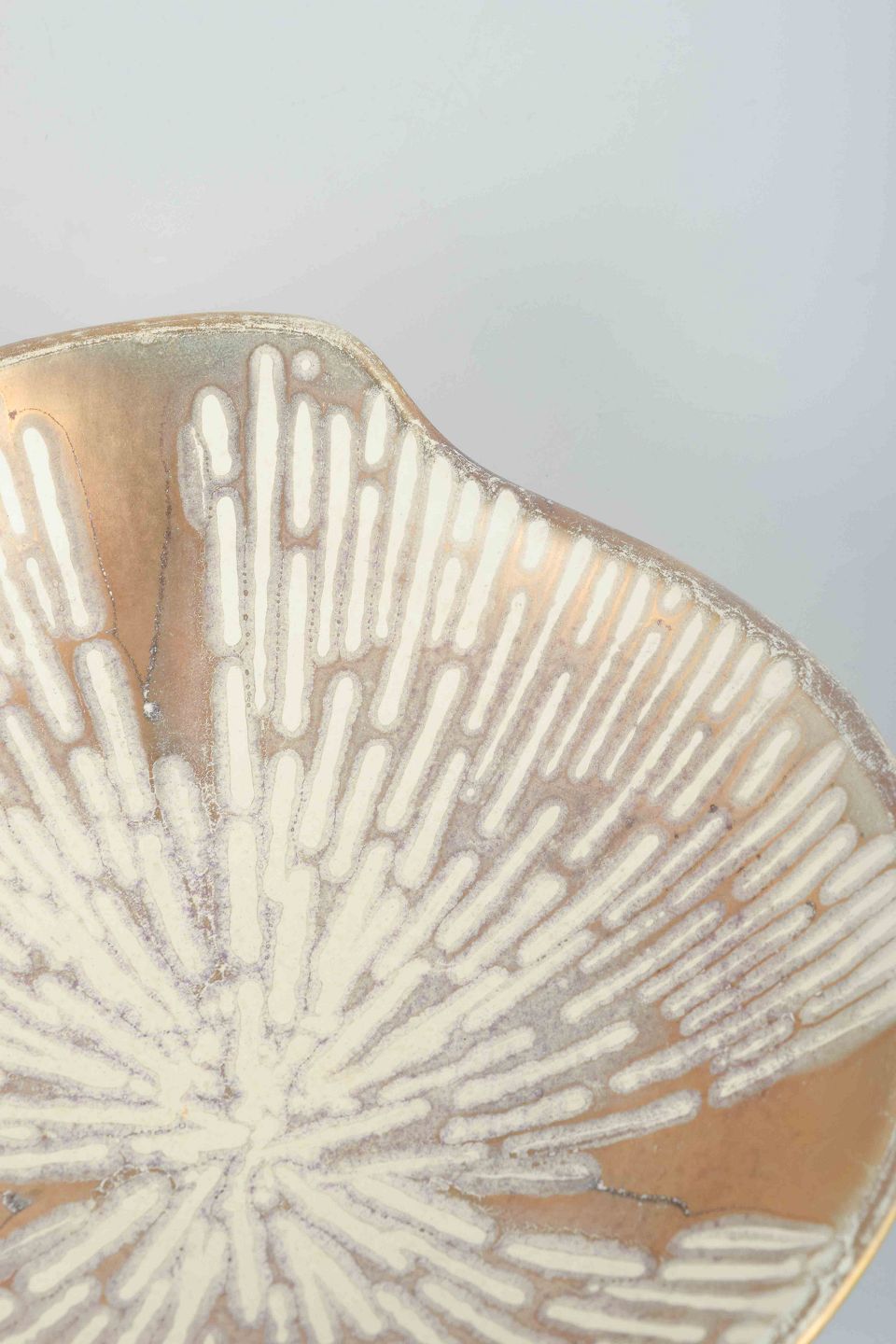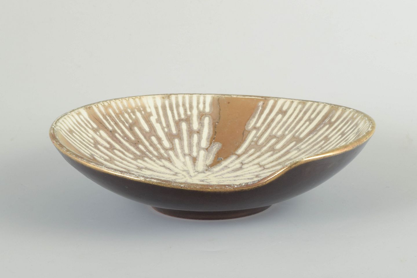 Wheel-thrown stoneware bowl with organic form. Interior decorated with radiating white and golden glaze pattern on a light brown base. Exterior with dark, almost black glaze.