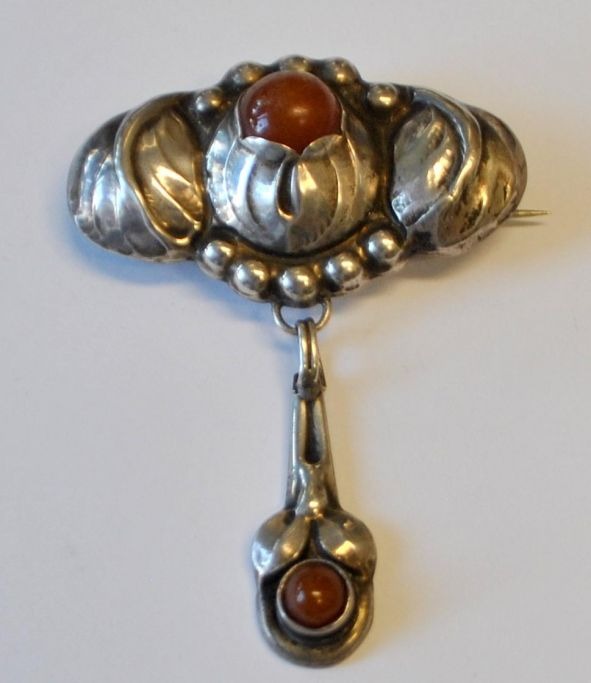 Dansk jugend brosche i sølv med rav, 20. årh. Hans Jensen & Co, København