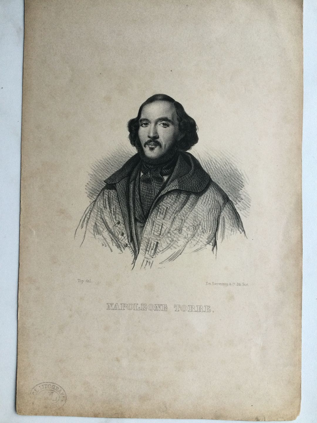 Litografi af Em. Bærentzen - Portræt af Kammersanger Napoleone Torre