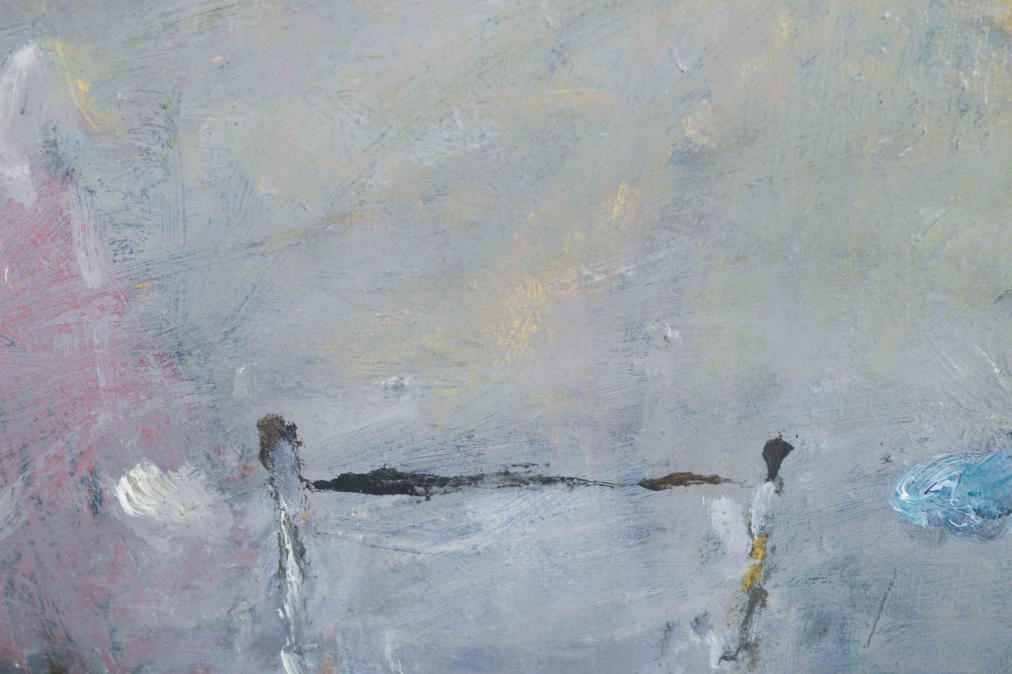 Et stemningsfuldt abstrakt maleri med suggestive træk, hvor en port i forgrunden åbner sig mod et tåget landskab. Farbepaletten domineres af dæmpede grå, blå og violette toner, med accenter af gult og rødt, der giver kompositionen en drømmeagtig og poetisk karakter.