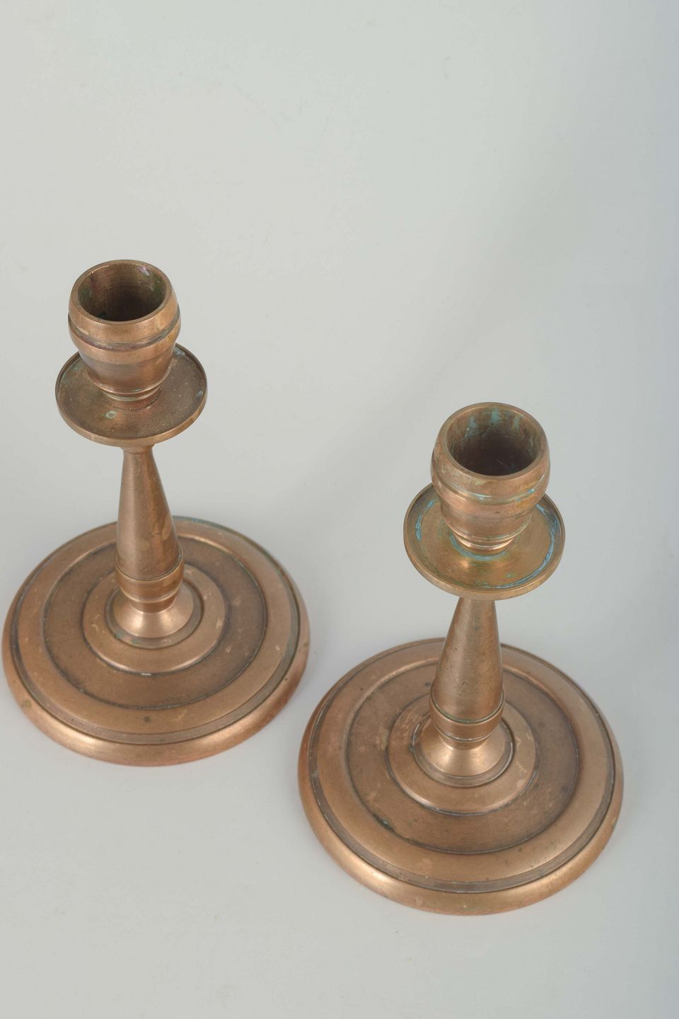 Massive messingstager med rund fod og geometriske ringdekorationer, typiske for perioden.