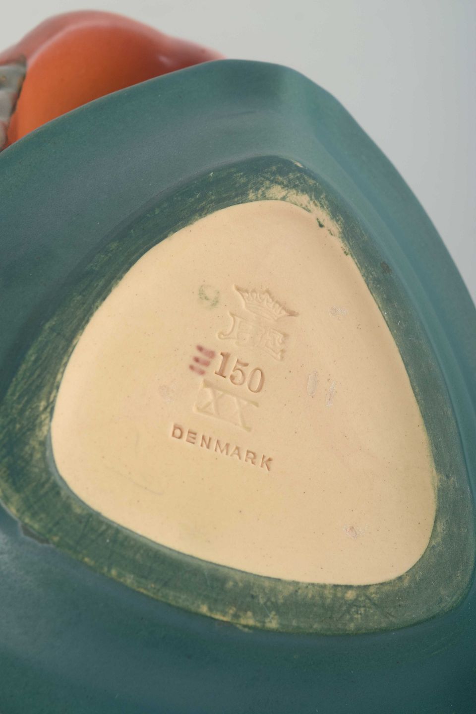 Et sæt bestående af tre dele udført i stentøj med flerfarvet begitning og glasur i orange, grønne og brune nuancer. Omfatter: askebæger med naturmotiv, lille vase på tre ben samt pibeholder med organiske former.