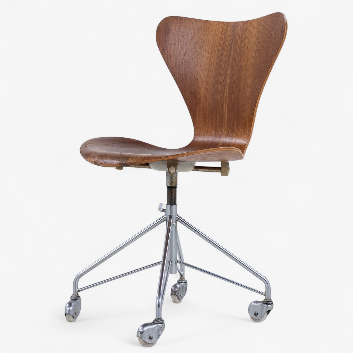 AJ 3117 - 'Syver'-kontorstol i patineret teak på gammelt stel med højdejustering. Stemplet fra producent.