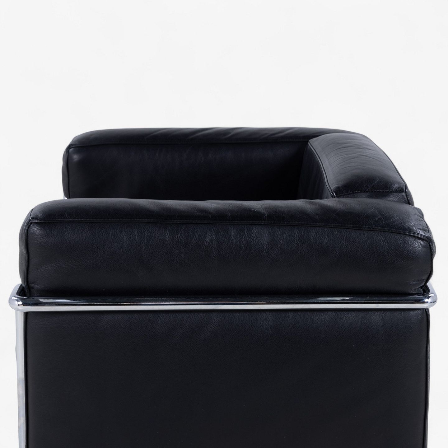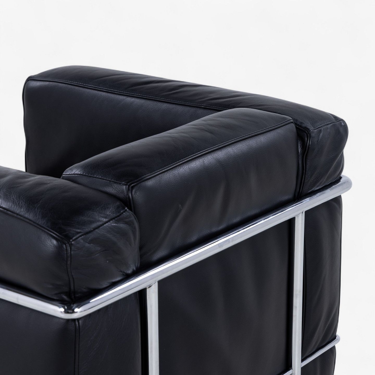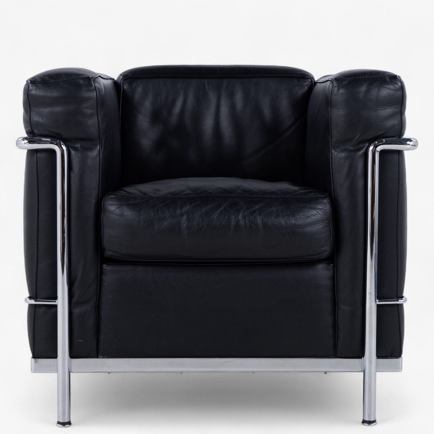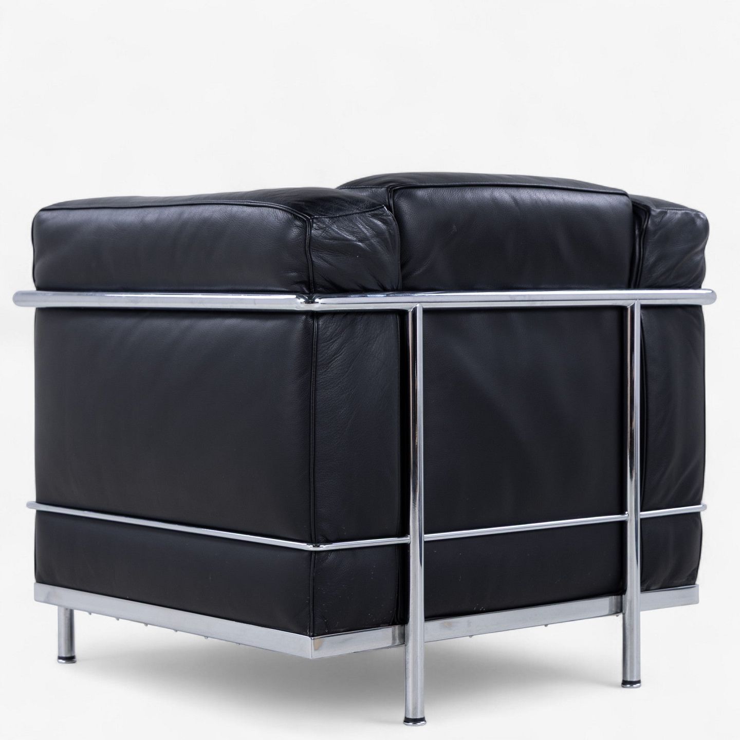 LC 2 - Lænestol i originalt sort læder med stel i stål. Stemplet fra producent.