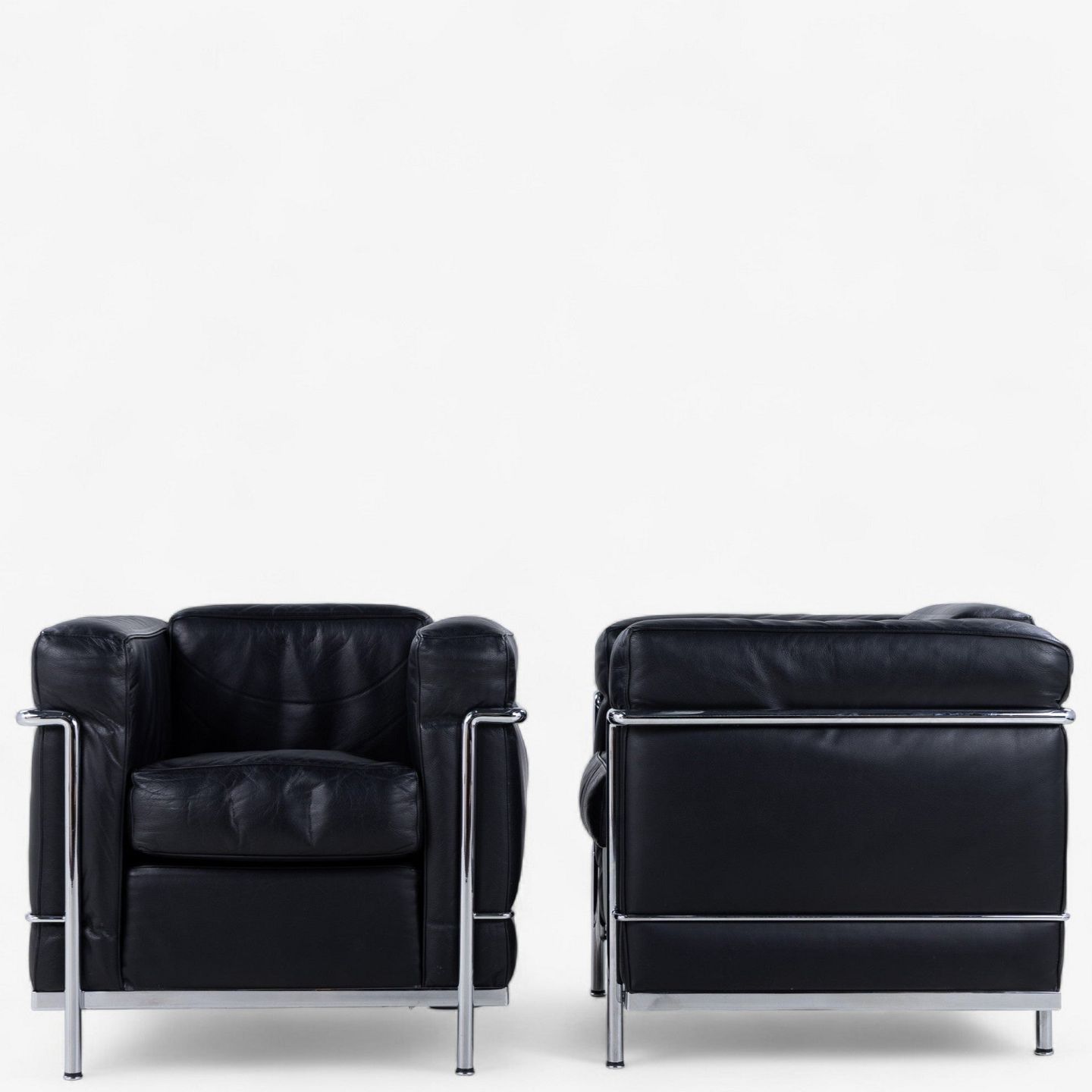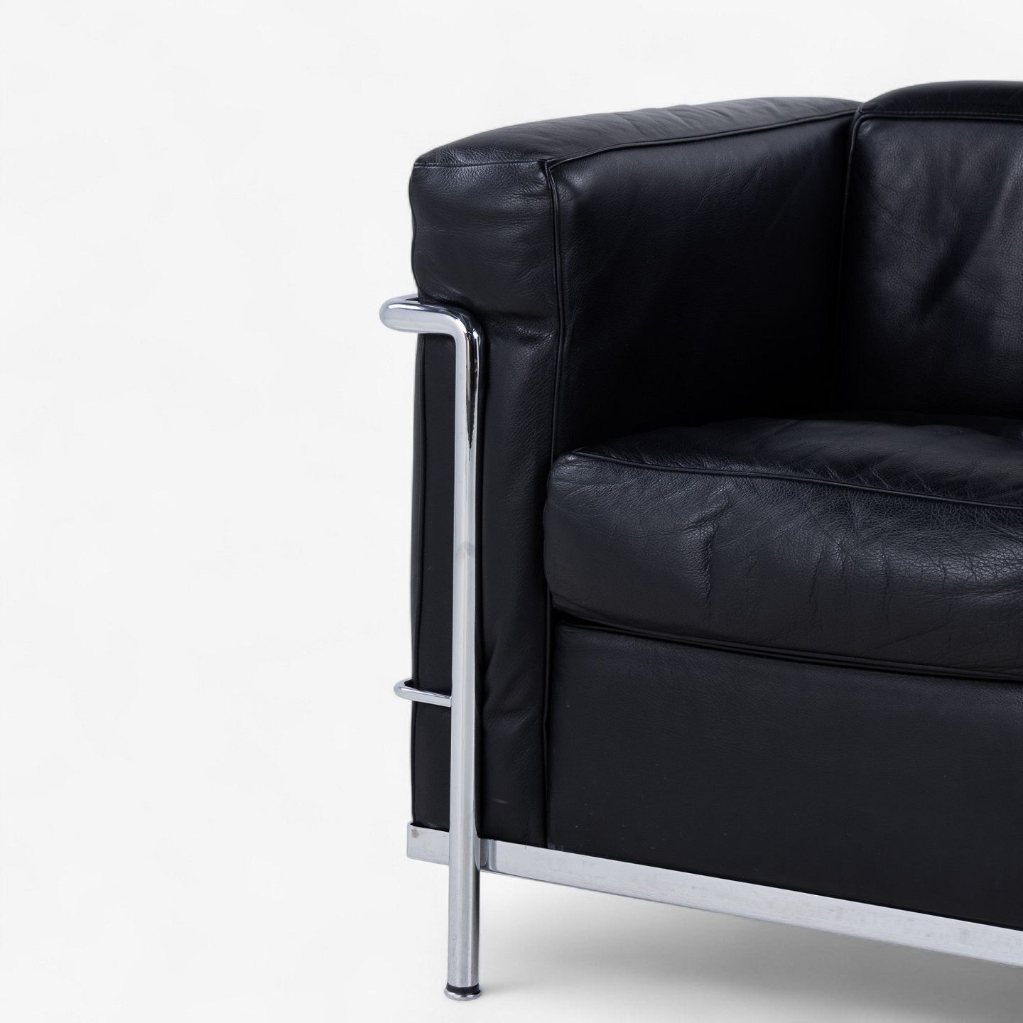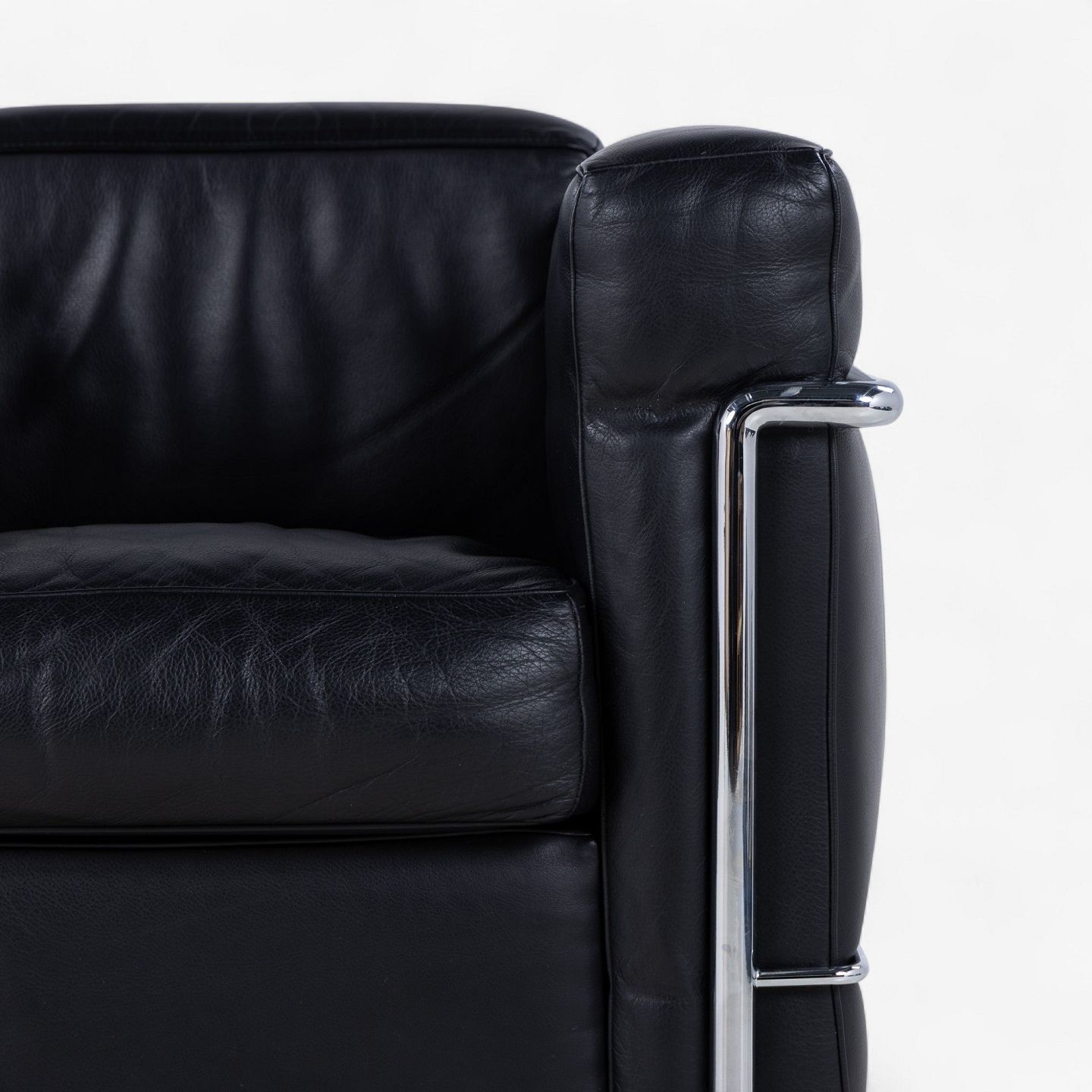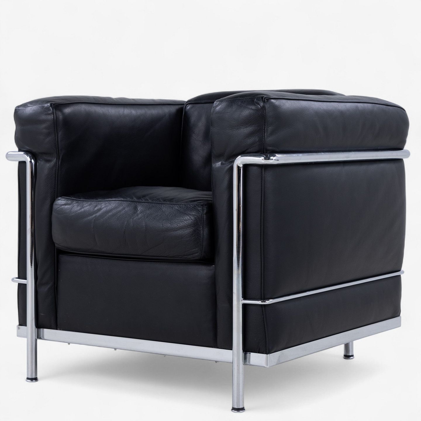 LC 2 - Lænestol i originalt sort læder med stel i stål. Stemplet fra producent.