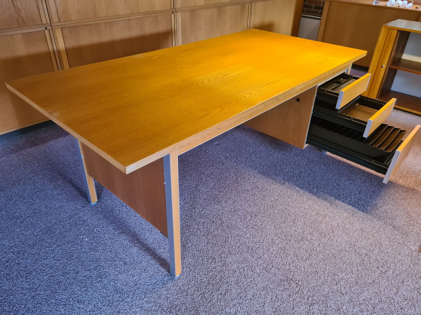 Stort Skrivebord fra 1980'erne i eg og aluminium. Fremstår pænt, velholdt og udmærket funktionsdygtigt. Dog med meget let afblegning på bordpladen efter en skrivemåtte. (Ses på billede)