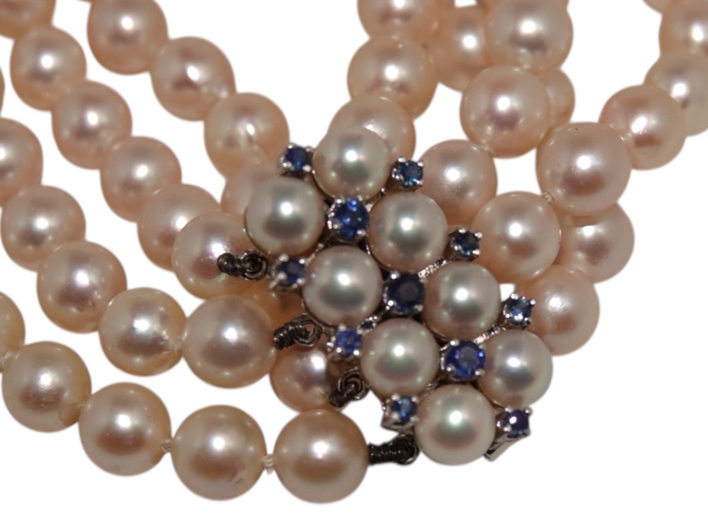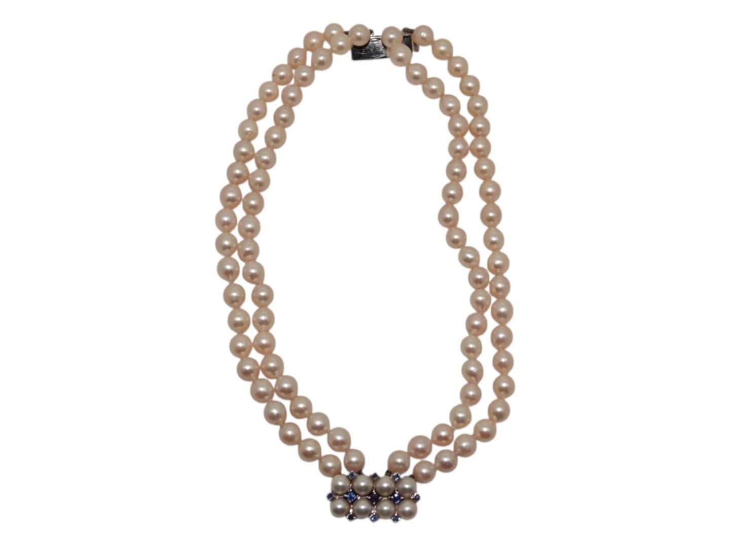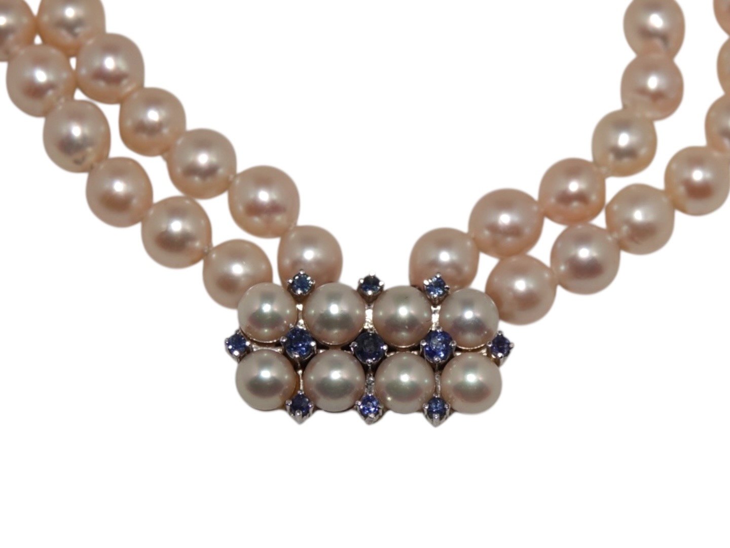 Dobbeltradet perle armbånd af store japanske rosa Akoja perler med 14 karat hvidgulds vedhæng med safirer