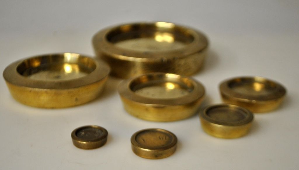 Samling engelske messinglodder, 19. årh. I alt 7 stk. 1/2 Oz, 1 oz, 2 oz, 4 oz, 8 oz, 1 lb og 2 lb. Dia. største lod: 9,5 cm.