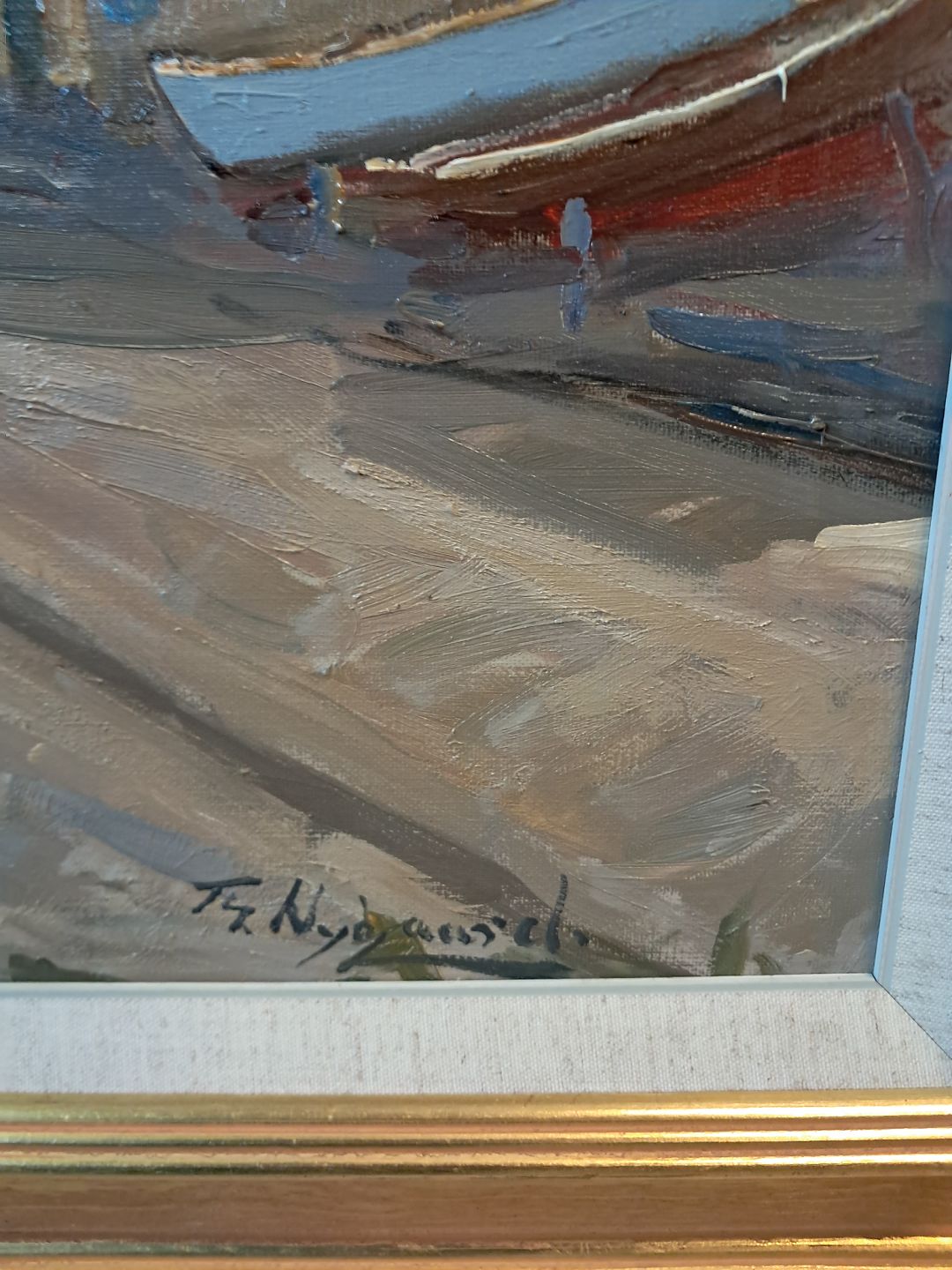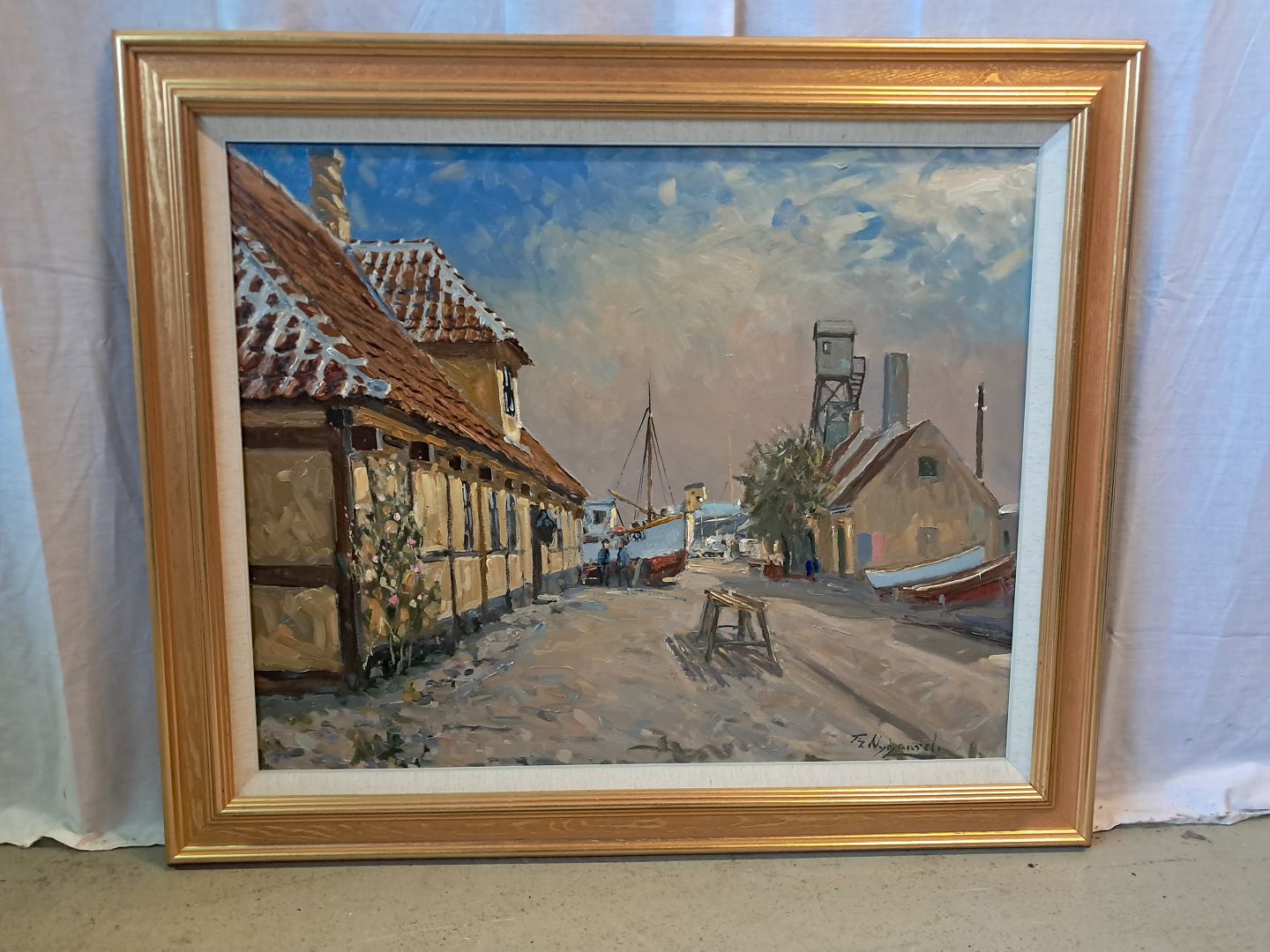 Maleri af Dragør Havn i guldmalet ramme, af : Th. Nygaard