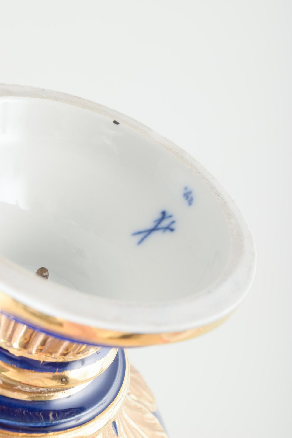 Stemplet med Meissens korslagte sværd i underglasurblå.