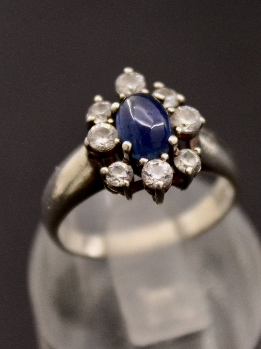 Sterling sølv ring størrelse 52 med cabochon sleben safir omgiver af klare stene emne nr. 623552