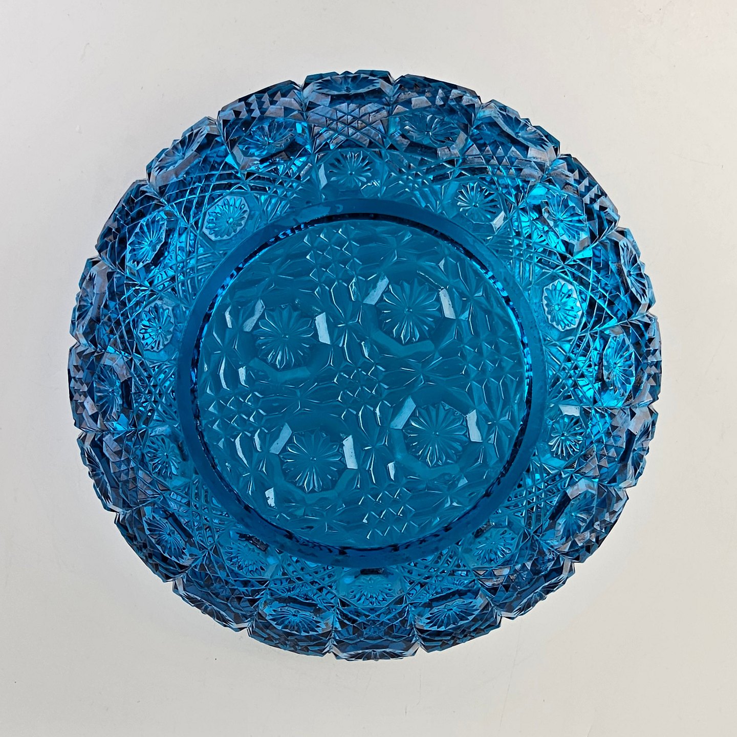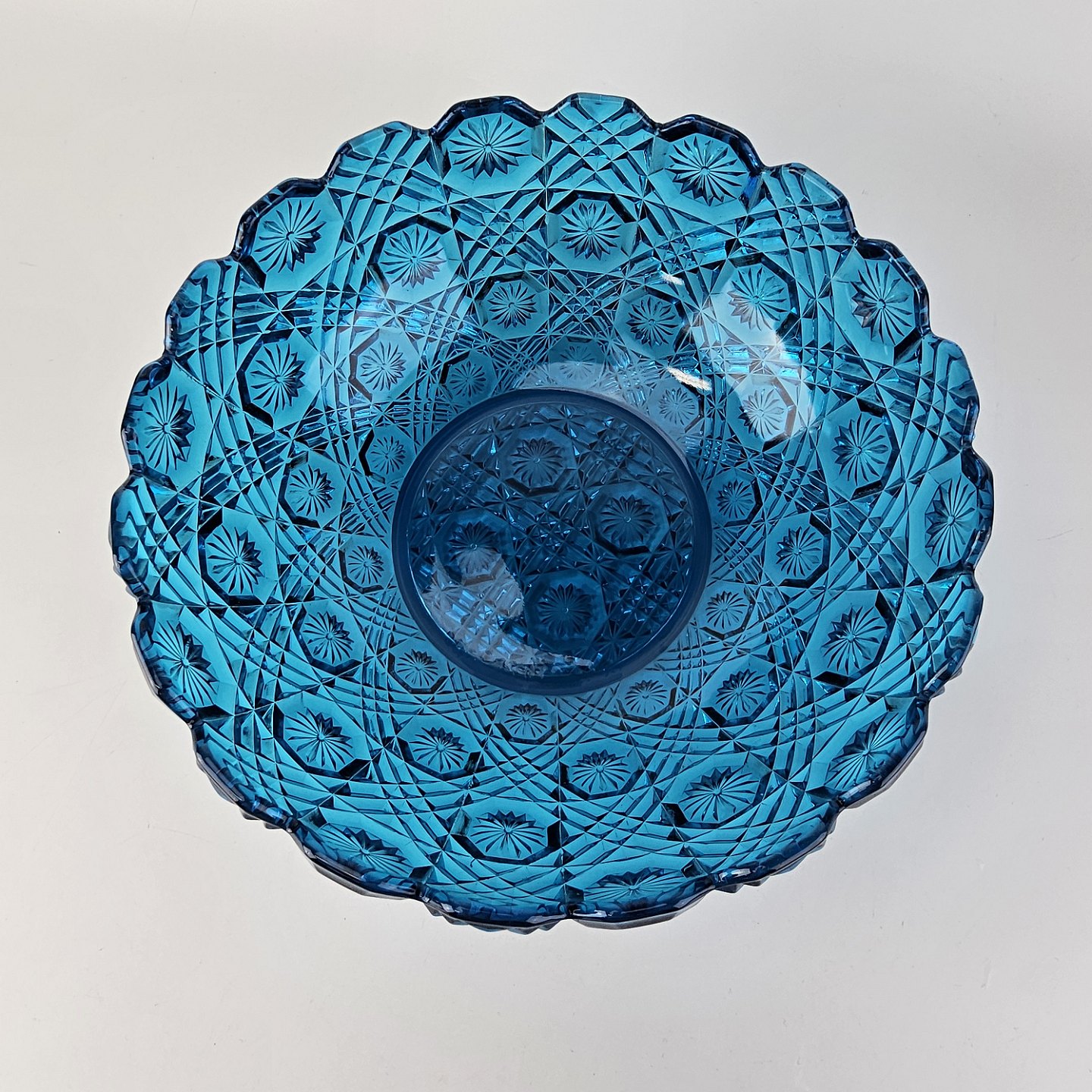 Blå diamantskål i presset glas med efterligning af skærslibning