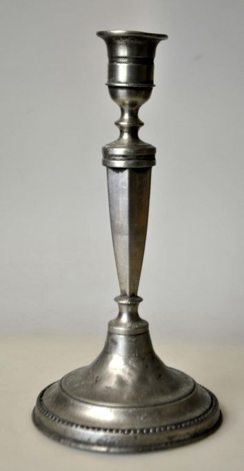 Dansk empire tin stage, 19. årh. Fod med perlestaf. 6 kantet stamme. Ustemplet. Nederst indgravering: N.L.S. H: 22 cm.