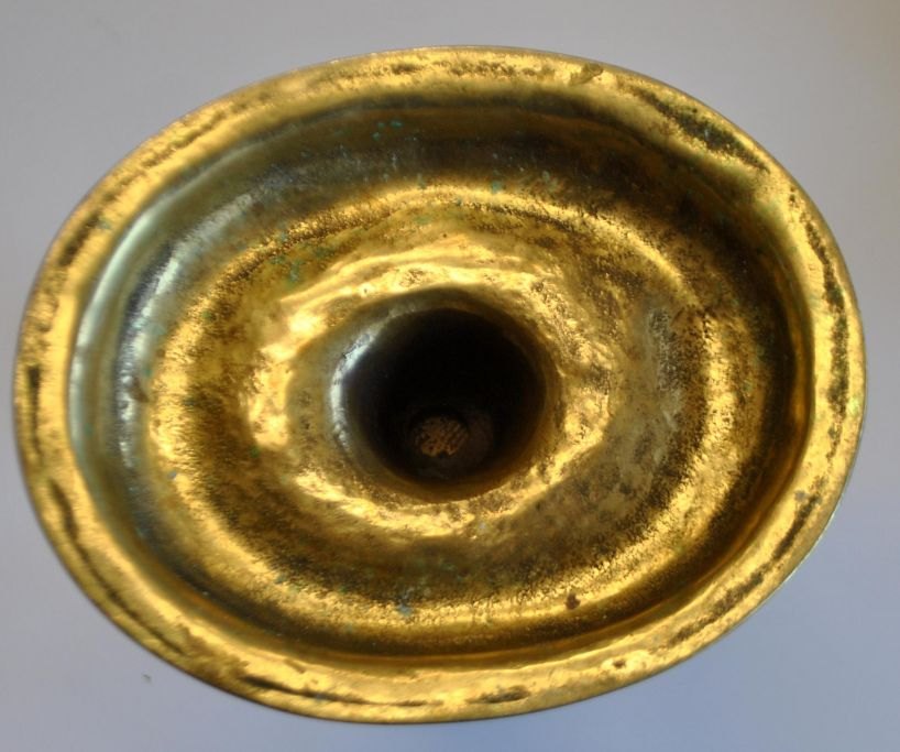 Engelsk barok lysestage i messing, 18. årh. På oval fod med kannelleringer. Drejet stamme. H.: 13 cm. Længde fod.: 12 cm.