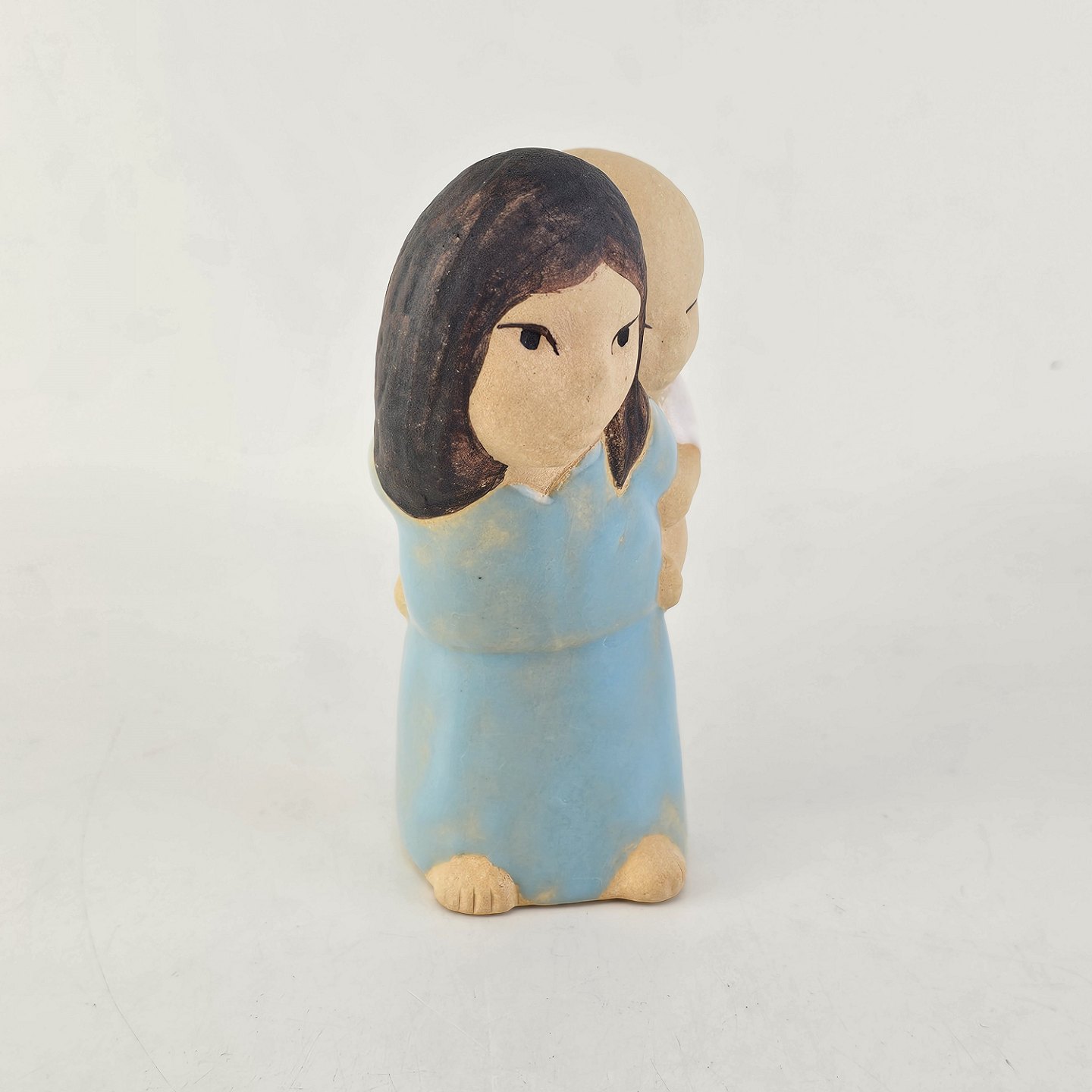 Figur i keramik med motiv af en pige med lys hud og brunt hår, som har et barn på ryggen.