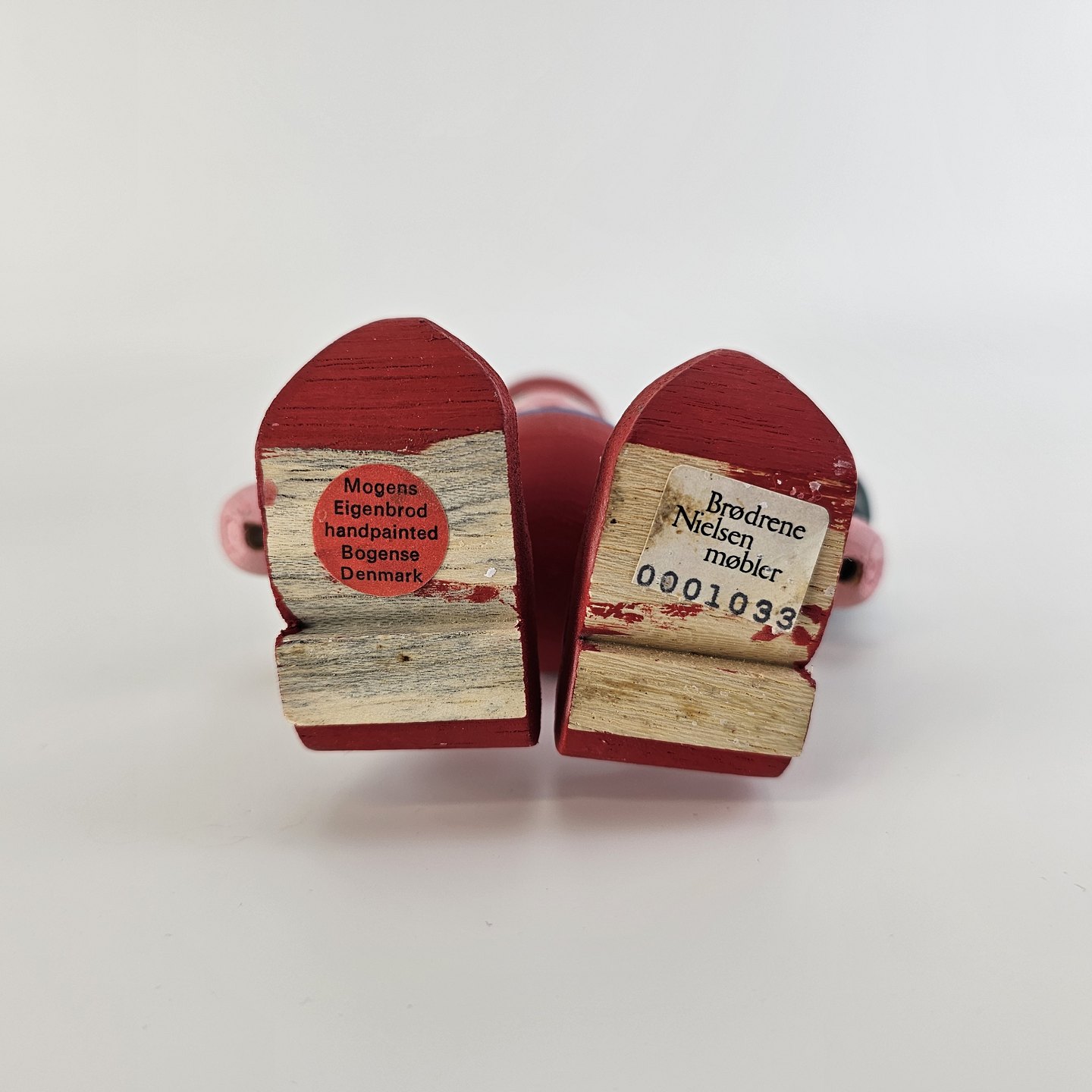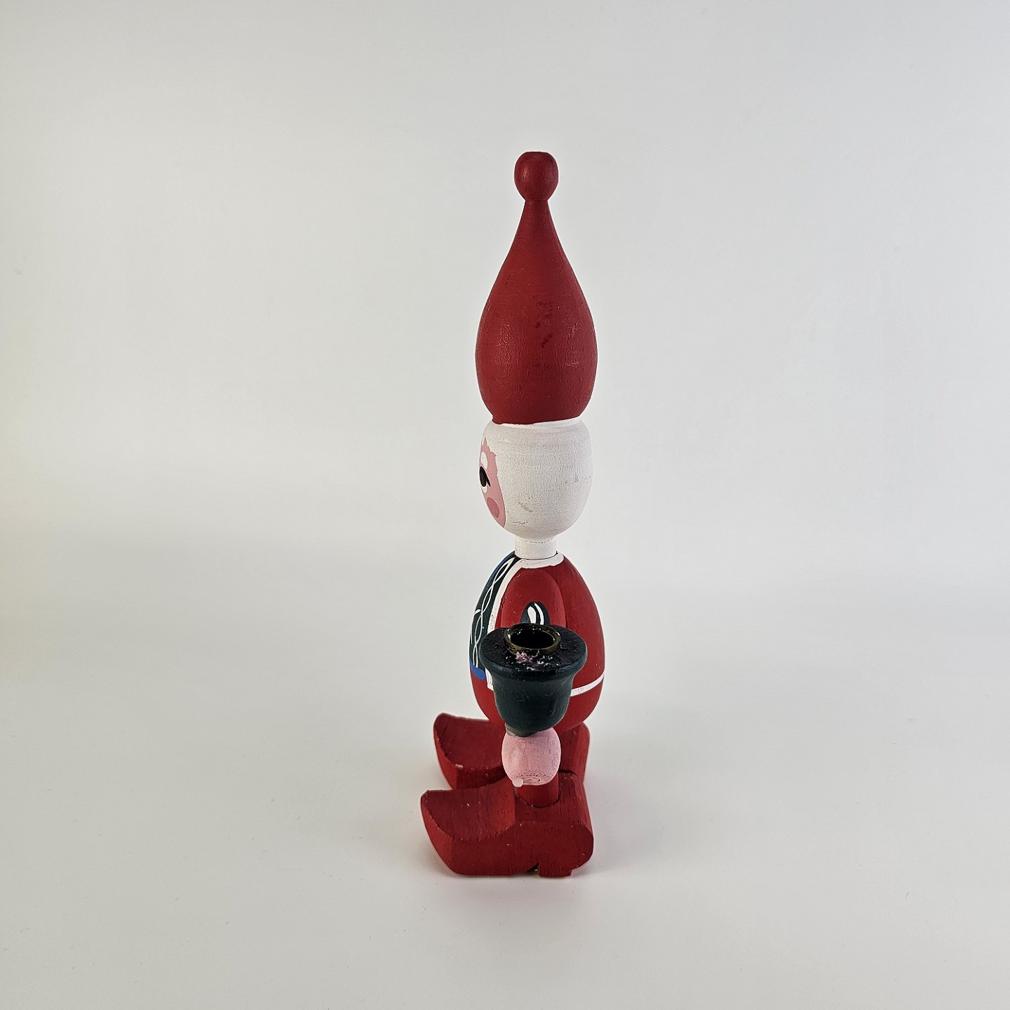 En håndmalet figur i træ med motiv af en nisse med en kerteholder