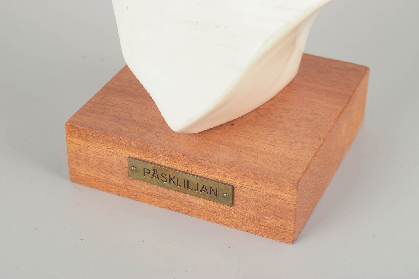 Hvidpatineret gipsbuste af ung pige på massiv træfod med metalskilt “PÅSKLILJAN”. Klassisk naturalistisk formsprog med blød, mat overflade.