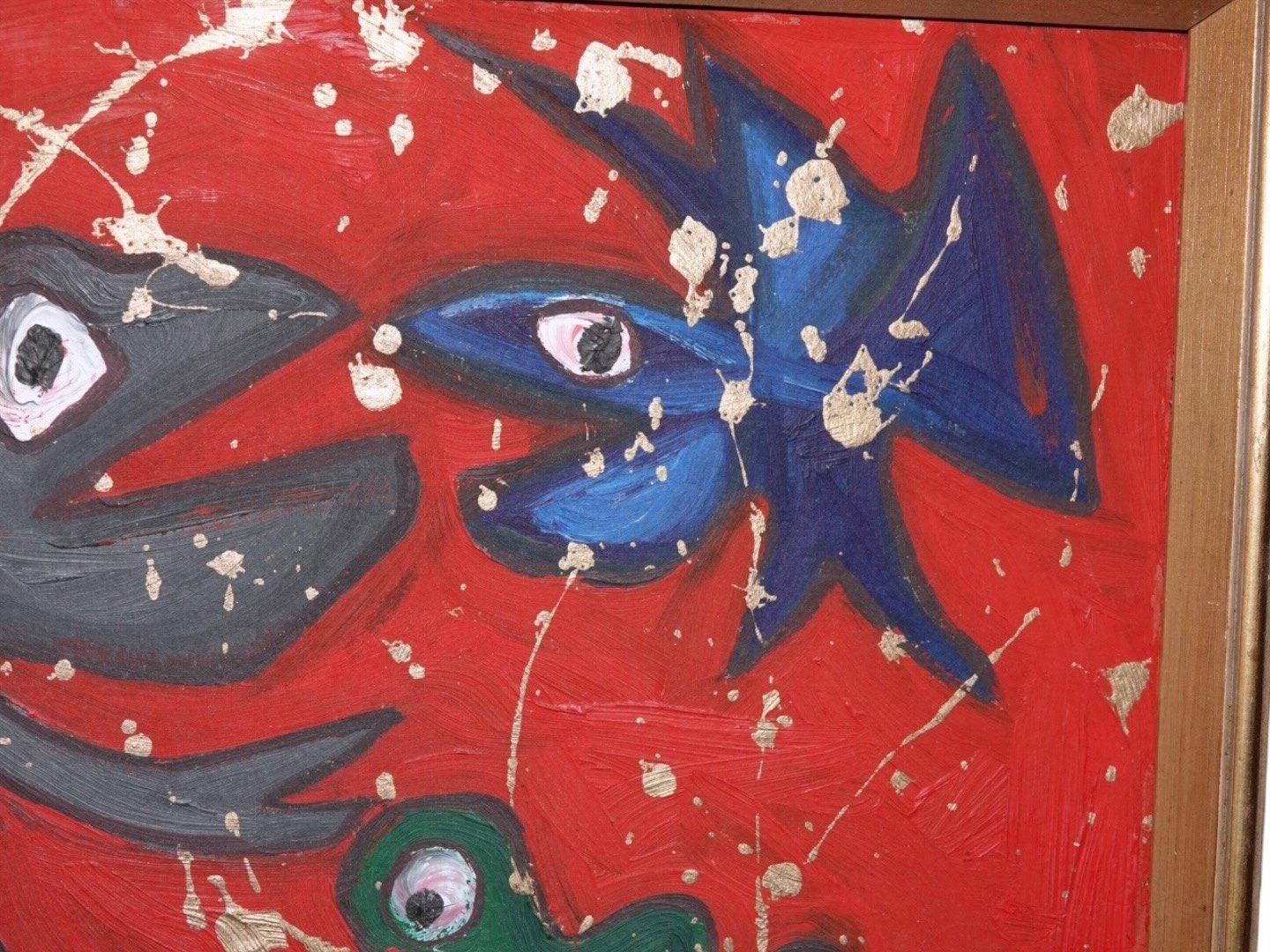 Susanne Kjær, moderne rødt oliemaleri med fisk.