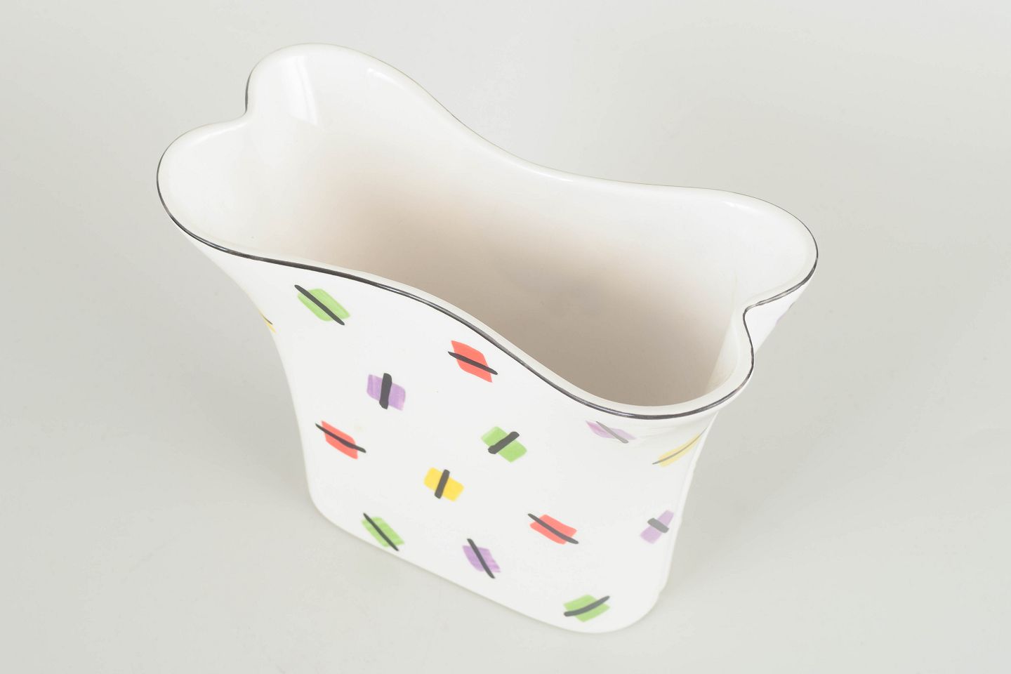 Faiencevase i karakteristisk Memphis-stil med bølgende form og håndmalet dekoration i klare farver – grøn, lilla, gul og rød – på hvid baggrund med sort kant. Et livligt og legende eksempel på Rönndahls design for Gustavsberg i 1980’erne.