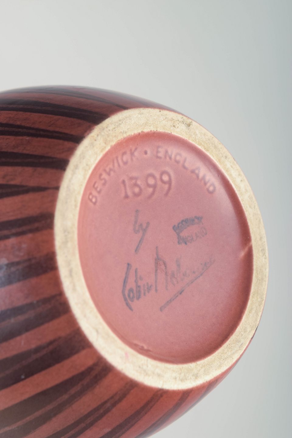 Elegant og karakteristisk vase i rødlig og brunlig lertone med hånddekoreret lodret mønster og organisk formet åbning. Undersiden mærket Beswick England 1399 samt signeret af Colin Melbourne.