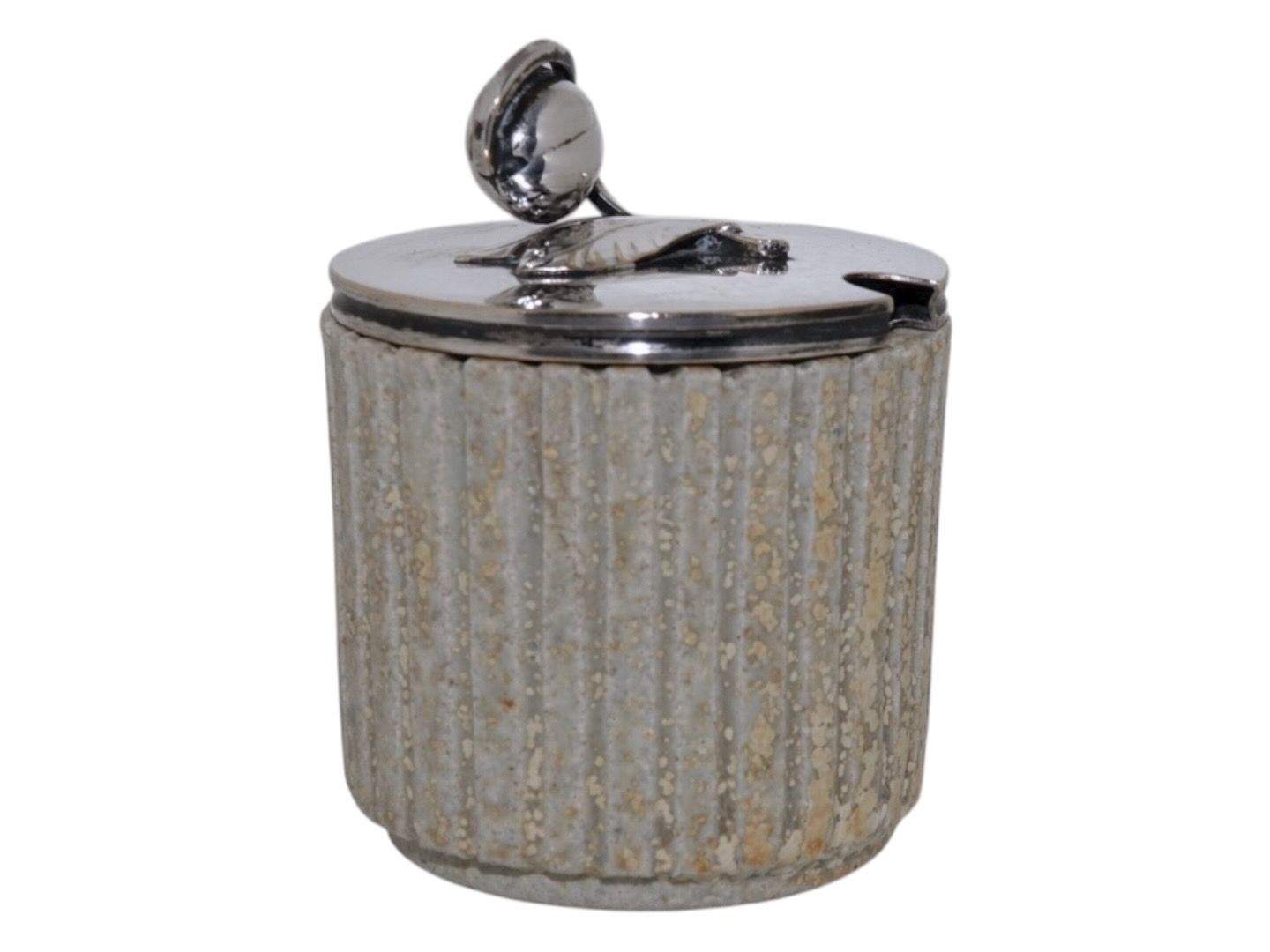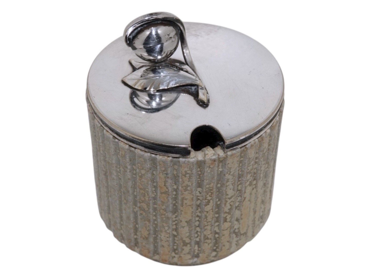 Arne Bang keramik, marmeladekrukke med låg i pletsølv.