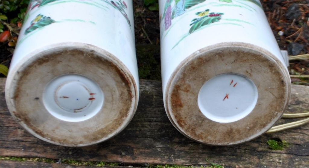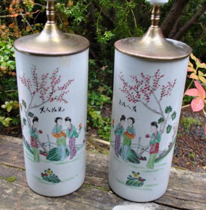 Par kinesiske hatstand i porcelæn, 19. årh. Omgjort til bordlamper. Håndmalede polykrome dekorationer af kvinde i have. Med tekst på kinesisk.  H.: 29 cm. Højde med elmontering: 53 cm.