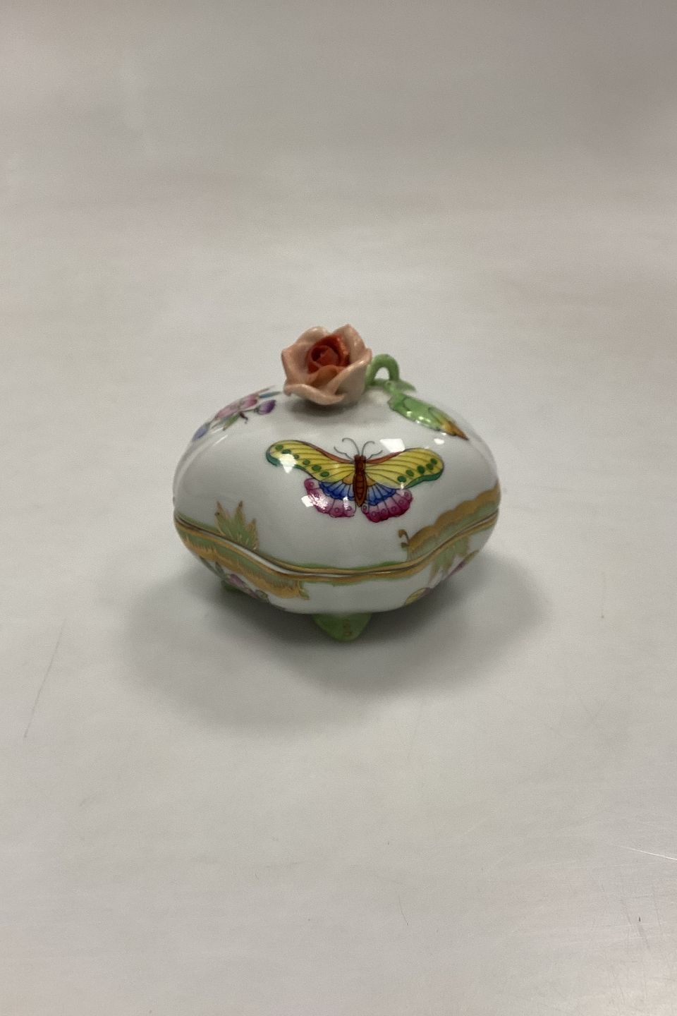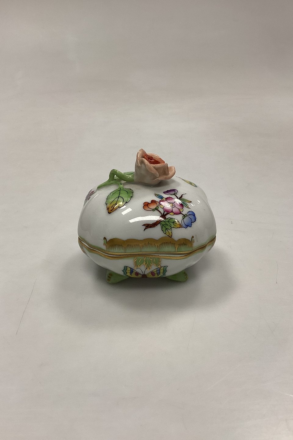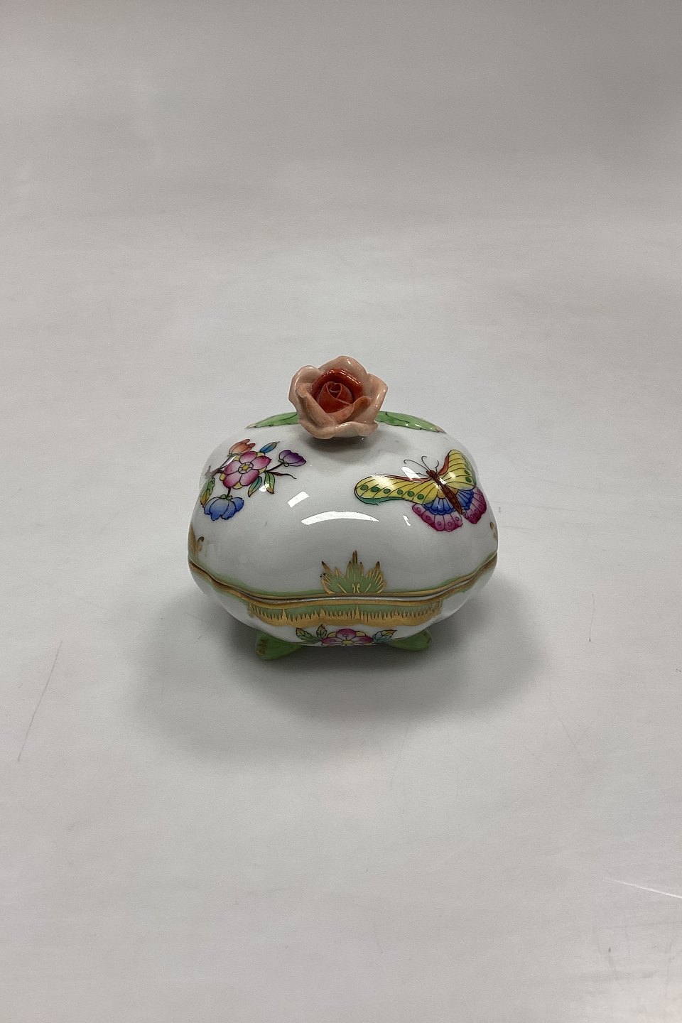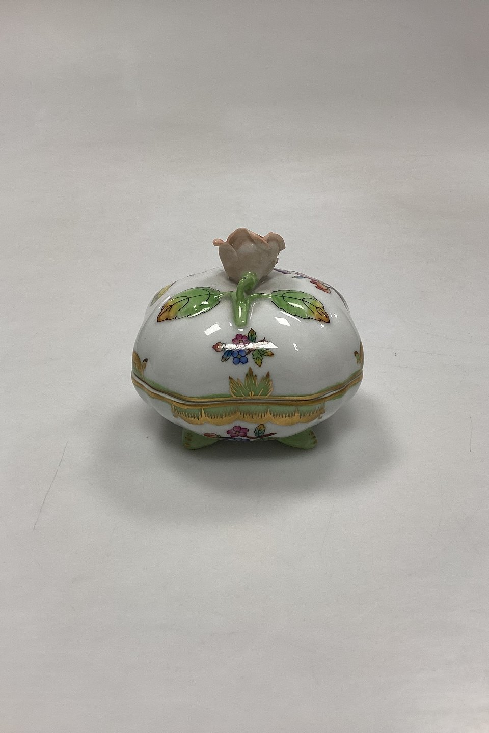 Herend Queen Victoria Green Bonbonniere No. 6179/V80. Measures H 6.5 cm / 2.55 in. with flower, D 7 cm / 2.75 in.