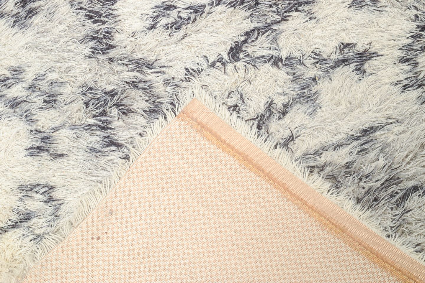 Stort håndknyttet rya-tæppe i uld med abstrakt mønster i sort og grå på lys bund. Designet “Vikingstad” af Clara Salander, et typisk eksempel på svensk tekstilkunst fra perioden, hvor håndværk, struktur og moderne formsprog blev forenet i dekorative indretningsobjekter.