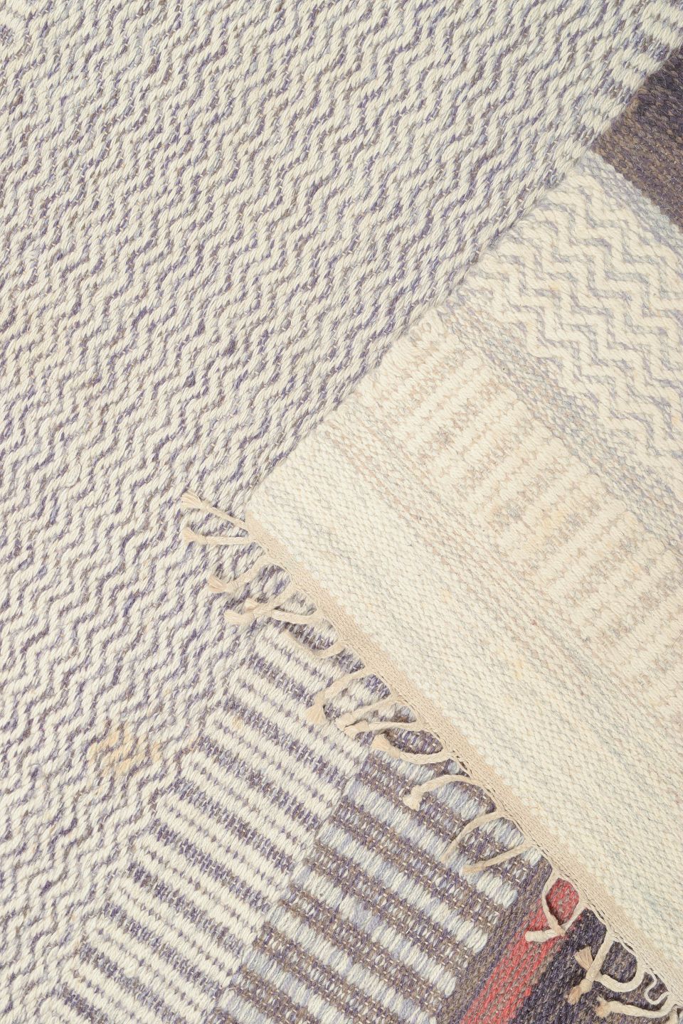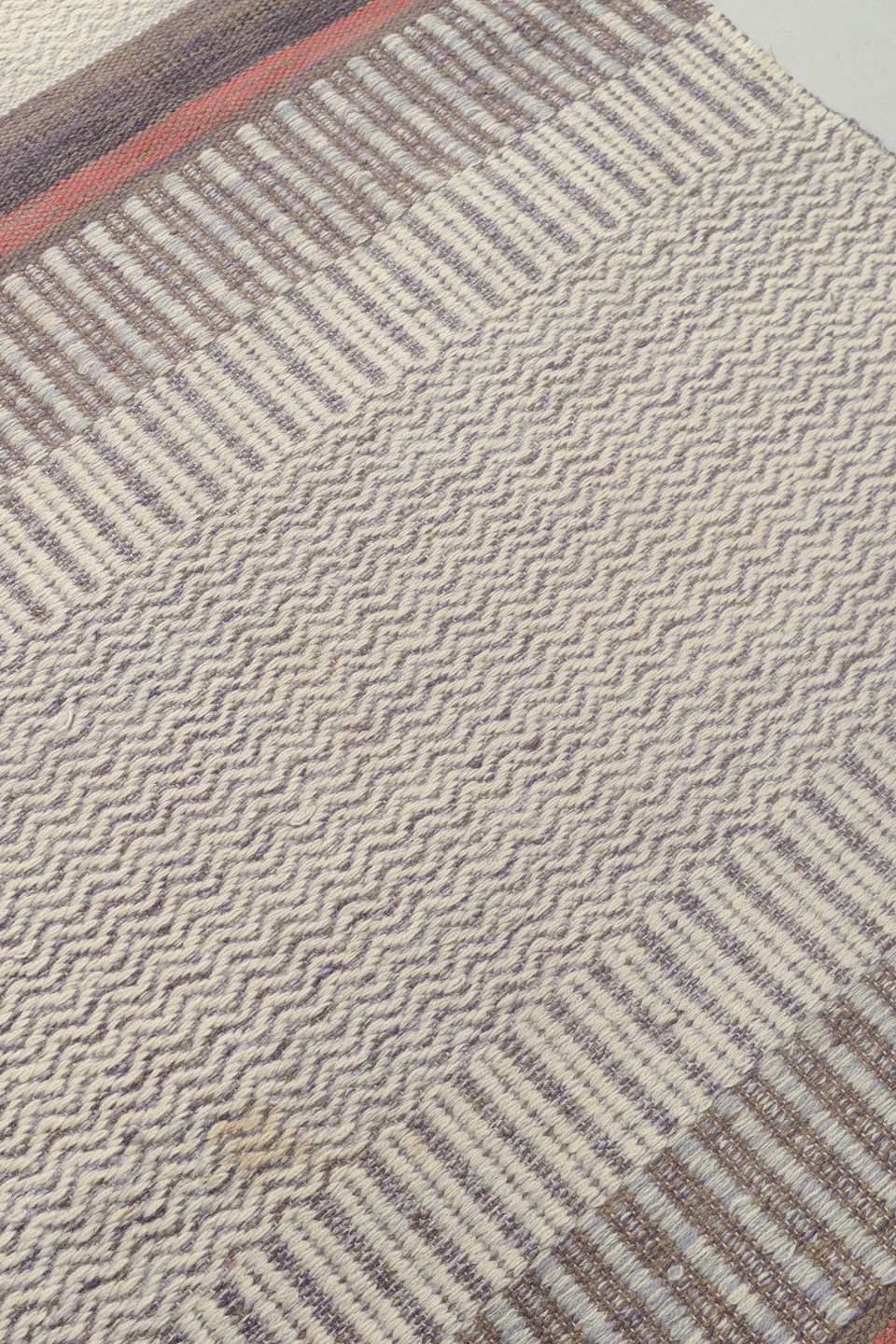 Håndvævet tæppe i ren uld med geometrisk mønster i naturlige nuancer af beige, brun og rødlige toner. En klassisk repræsentant for den skandinaviske tekstiltradition, hvor enkelhed og struktur går hånd i hånd med funktionalitet og varme.