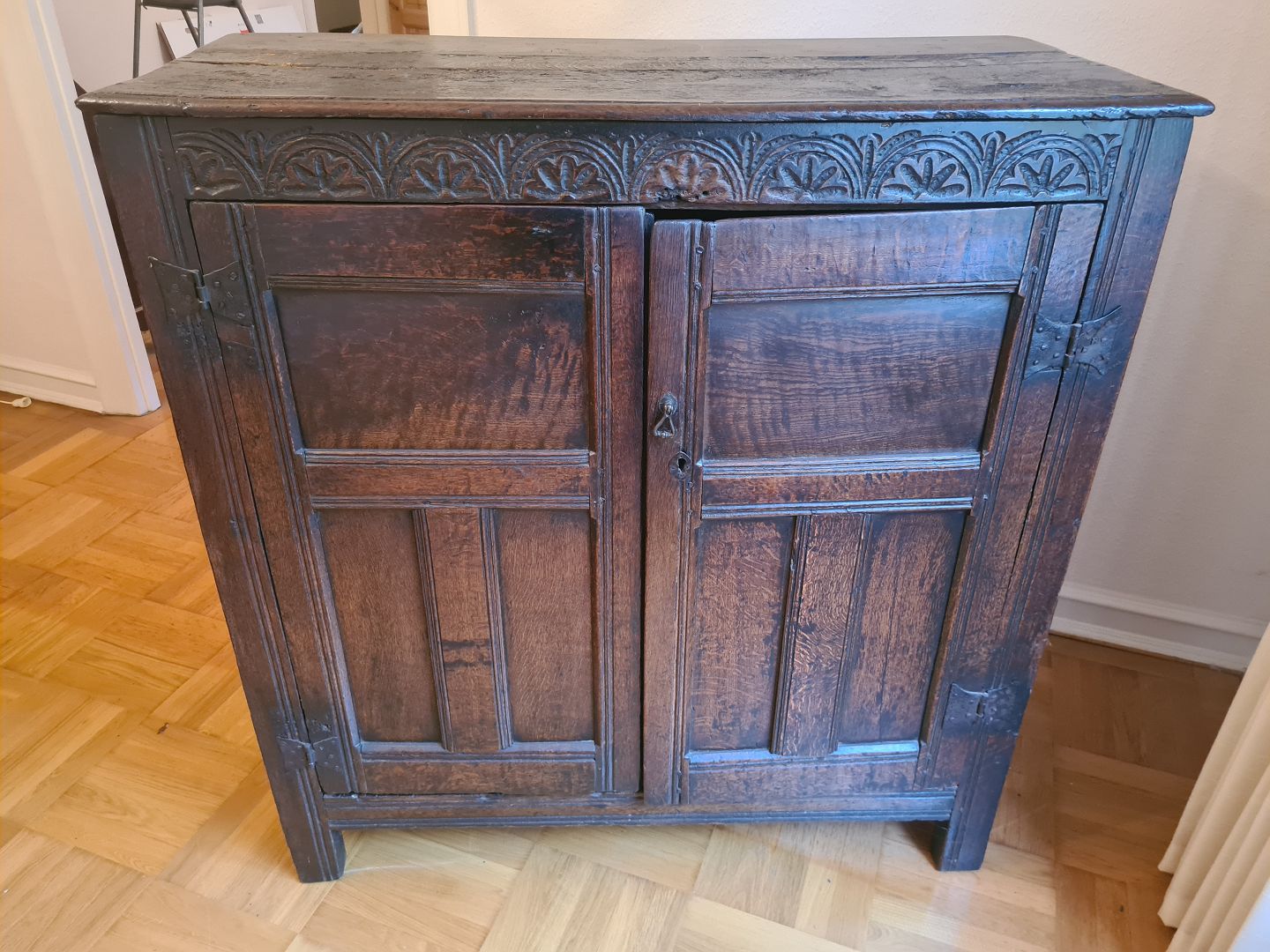 Antikt dækketøjsskab fra starten af 1800 tallet i eg. Fremstår godt og solidt med aldersrelaterede brugsspor på toppen.(billede) Umiddelbart uden nøgle.