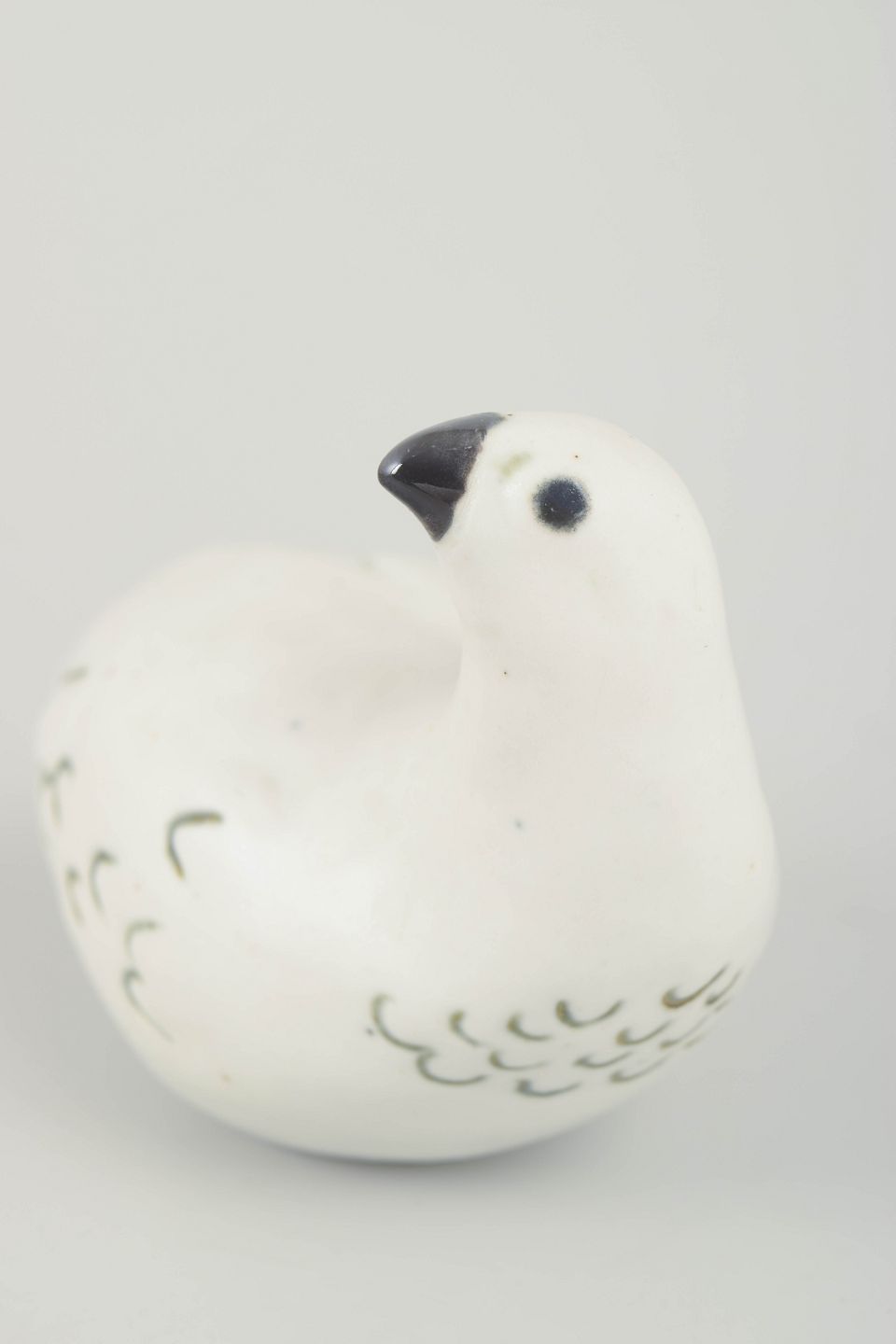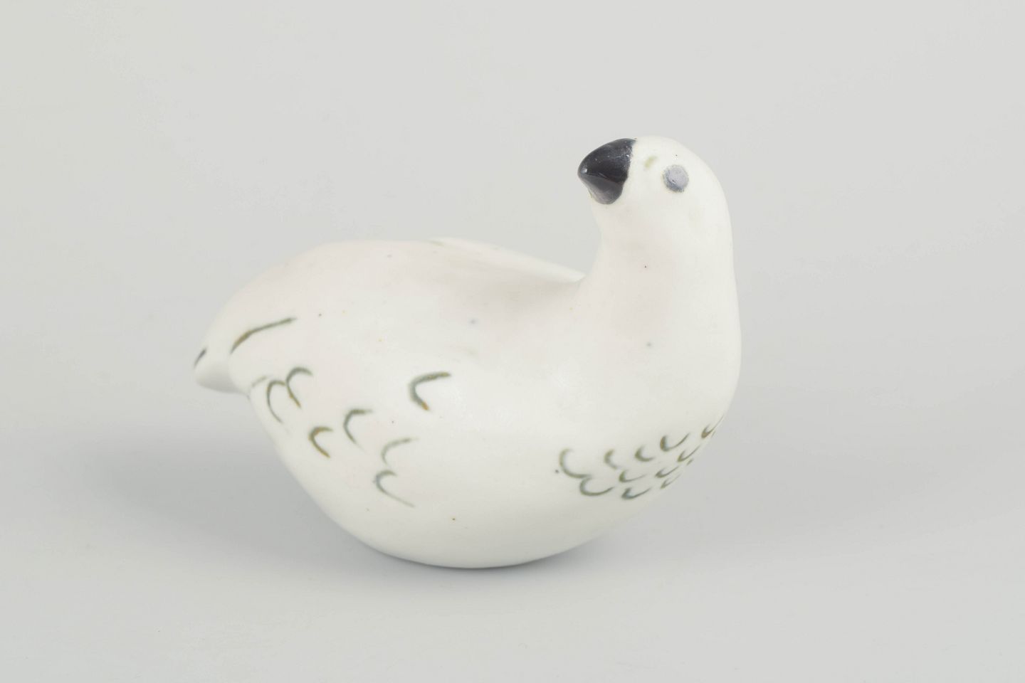Skulpturel fuglefigur i glaseret stentøj, formet med bløde linjer og enkel dekor i grønne og sorte penselstrøg. Typisk for Allerts organiske formsprog og naturinspirerede udtryk.