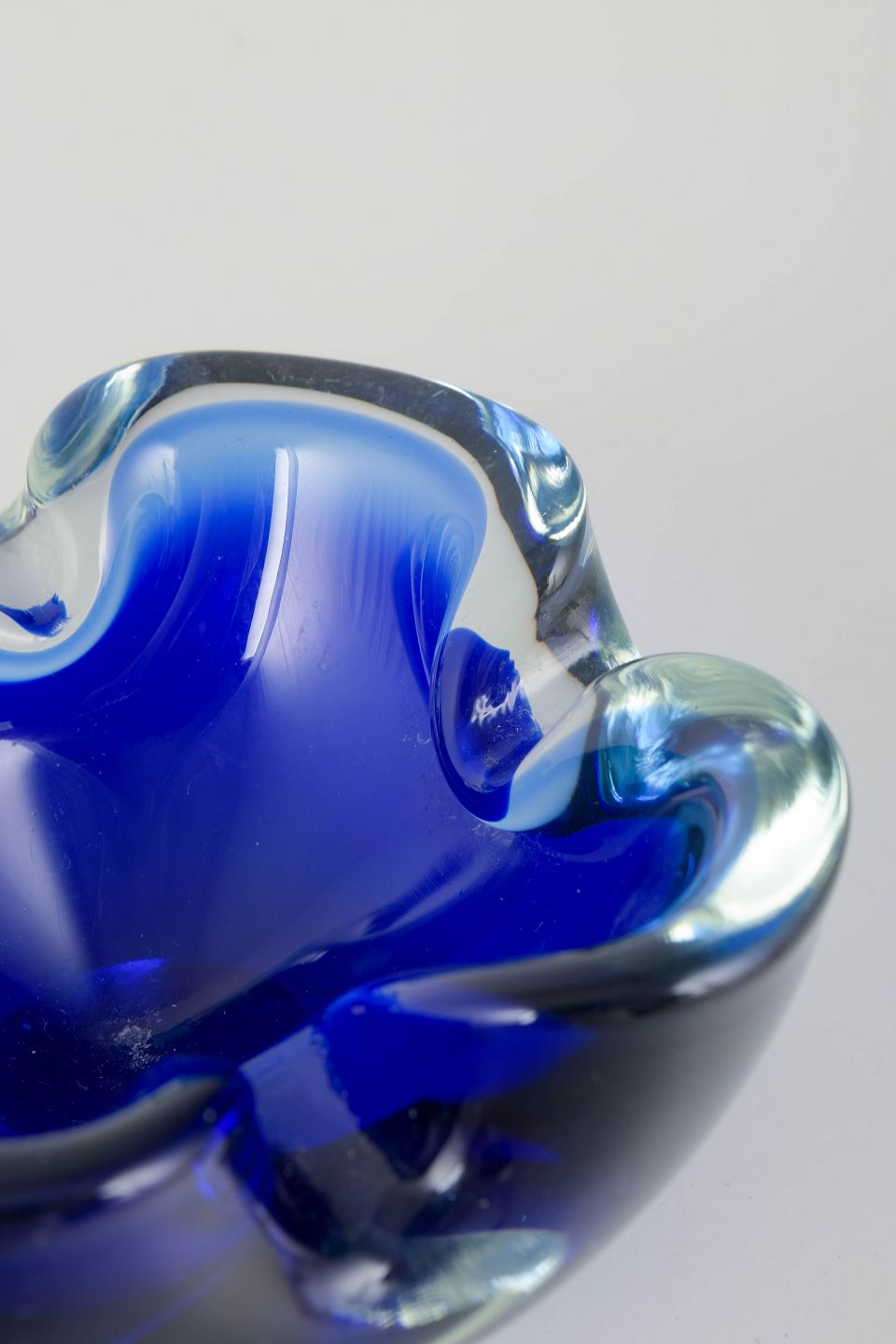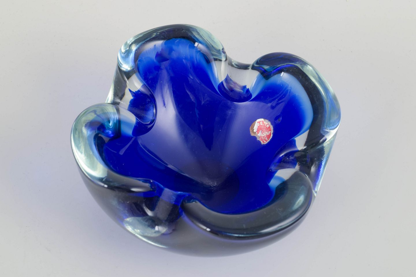 Organisk formet art glass-skål i håndblæst glas med kraftige folder og dyb koboltblå farve, med rester af originalt Made in Murano Italy label.