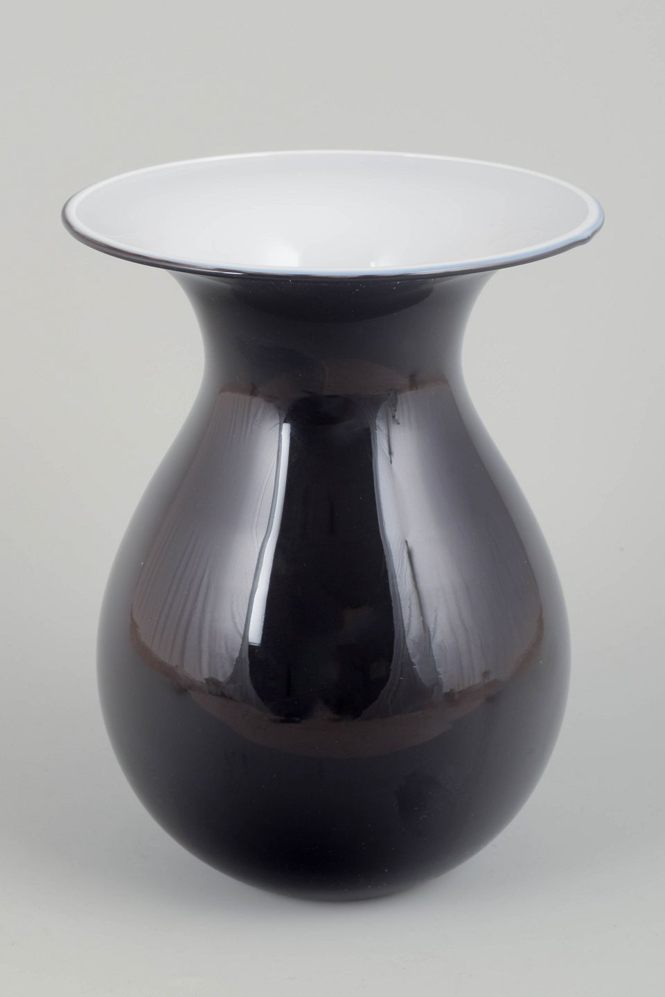 Elegant mundblæst vase i sort og hvidt glas fra serien Shape, designet af Peter Svarrer for Holmegaard. Klassisk form med blød kurvet silhuet og bred åbning. Original æske medfølger.