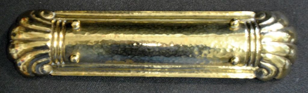 Messing penne holder, ca. 1920. Danmark. Hamret messing. Ender i form af vifter. På fire små fødder. L.: 33 cm. B.: 5 cm.