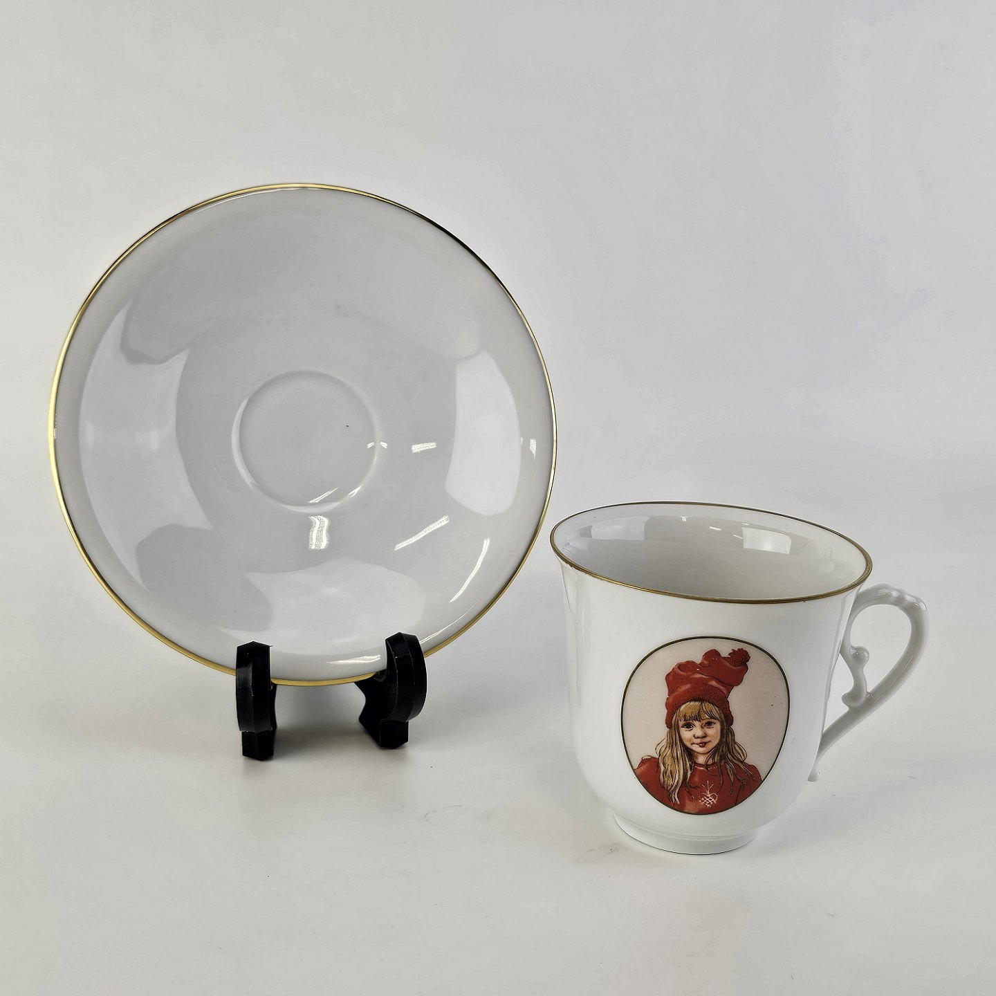 Kop med underkop i porcelæn med guldkant og platte i porcelæn med guldkant og udsnit af Carl Larsson malt 1900, fra Carl Larsson kaffestellet.