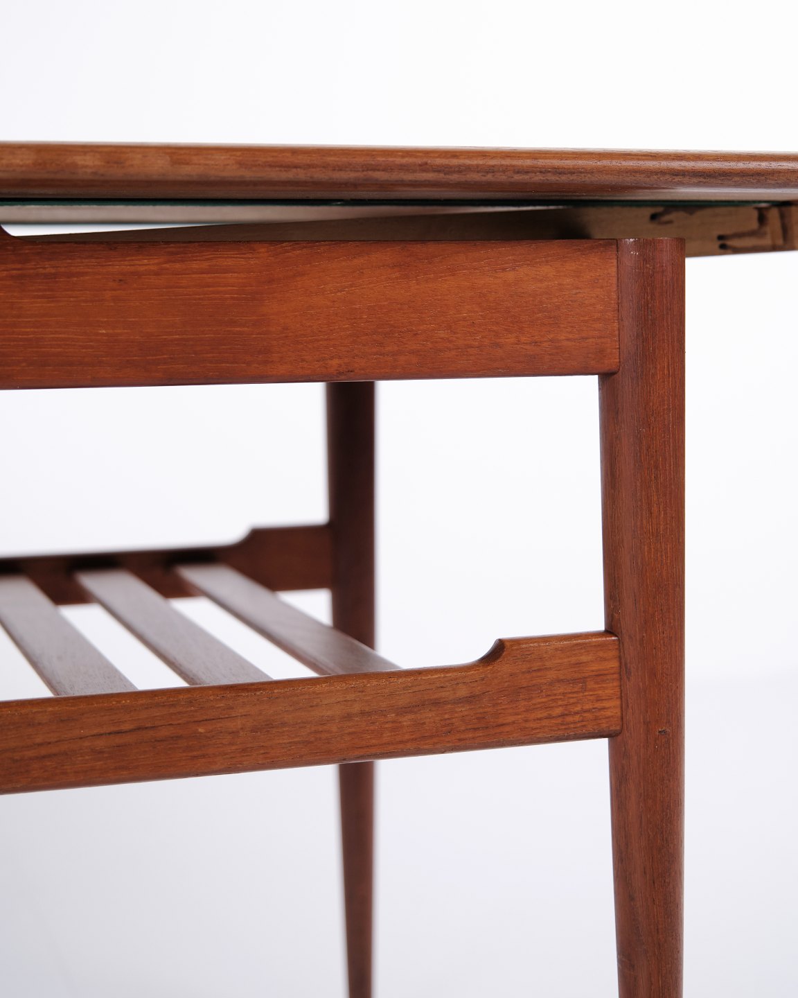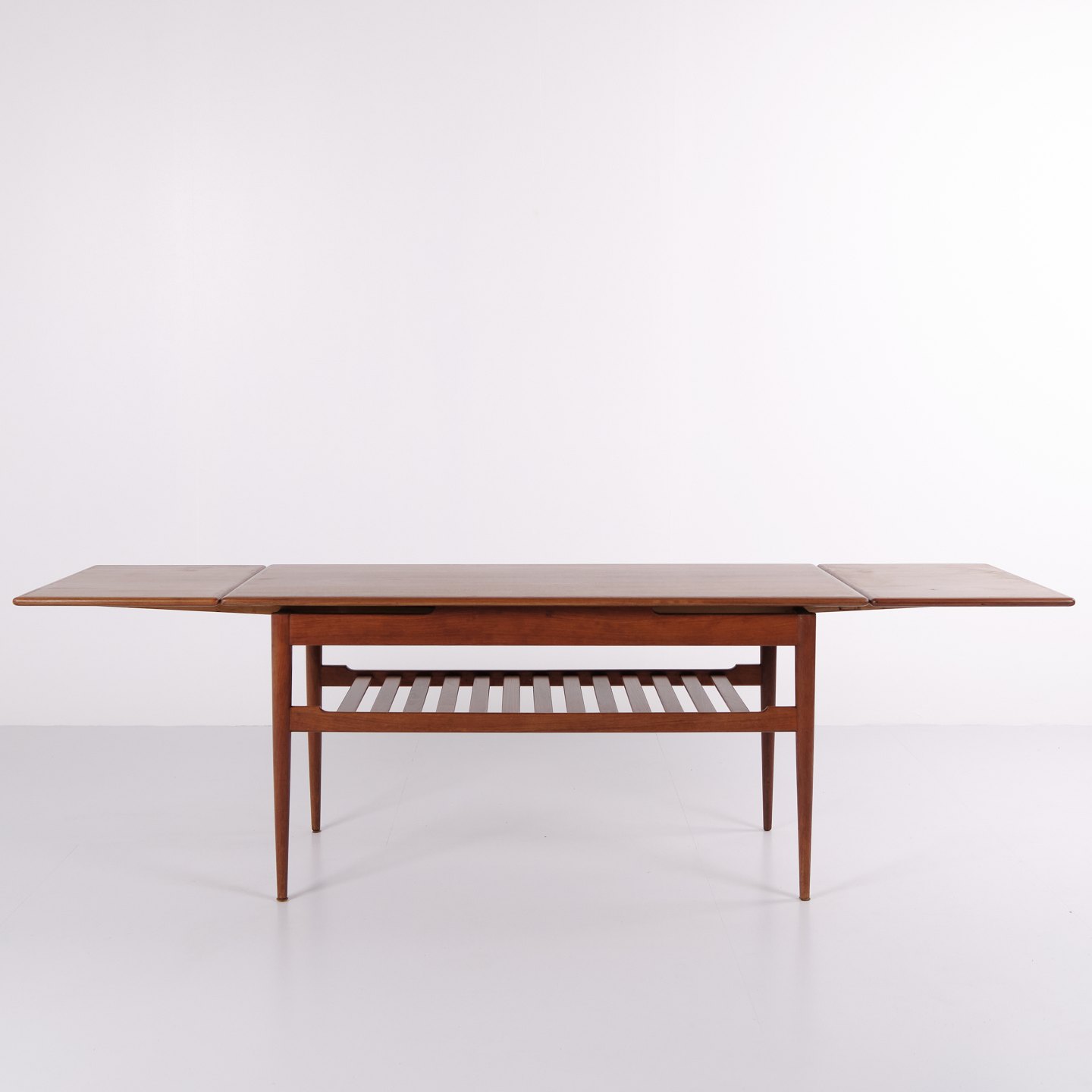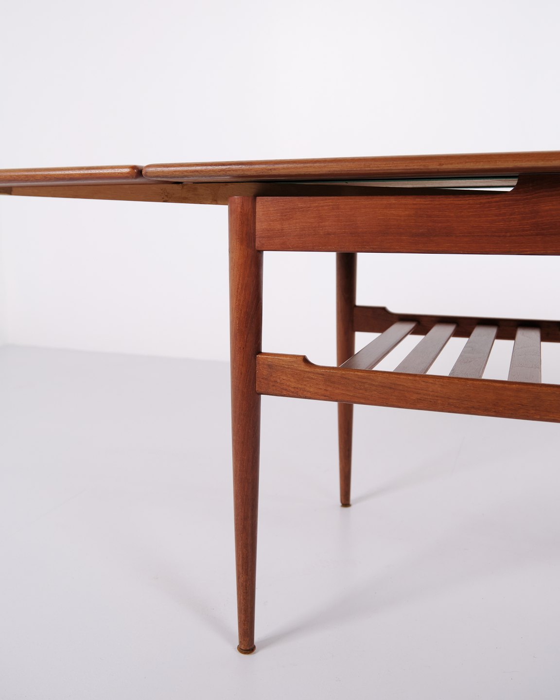 Sofabord fra 1960’erne, udført i teaktræ med praktisk hylde og udtræk, der giver ekstra bordplads efter behov.