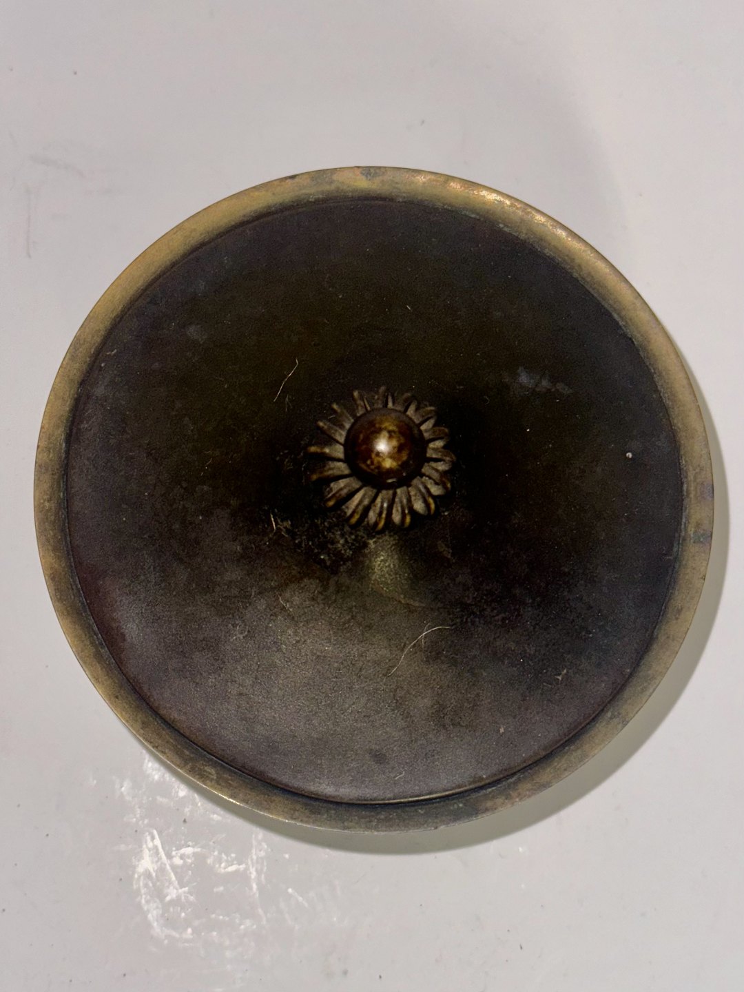 Bronzepatineret just Andersen skål. Fremstår i god stand med almindelige brugsspor. Fremstillet omkring 1940. Fabriksmærket på bunden med det velkendte fabrikslogo, modelnummer 1615 samt LB, der står for Let Bronce. H. 7 cm Ø. 11 cm
