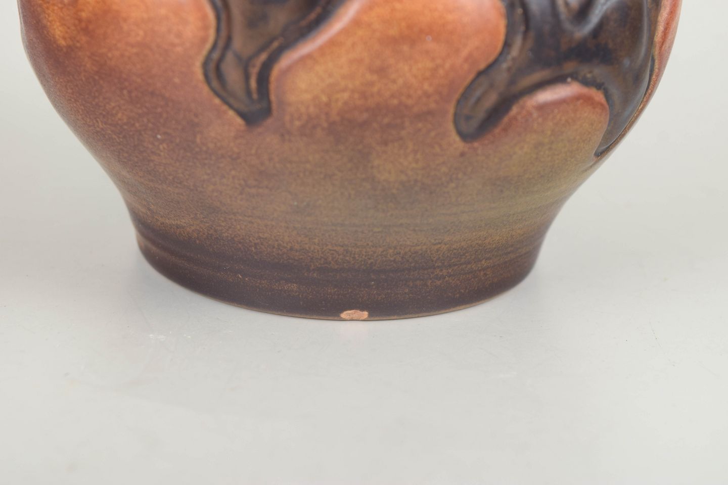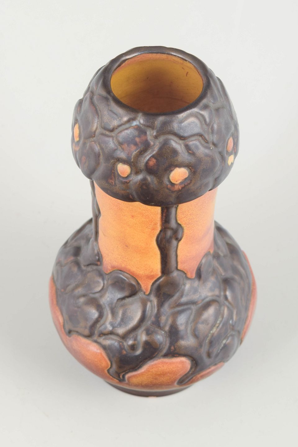 Art Nouveau-vase i glaseret keramik med karakteristisk plastisk reliefdekoration i mørkebrun glasur over varm gylden-orange bundglasur. En elegant og klassisk formgivning fra perioden, med tydelig inspiration fra naturens organiske former.