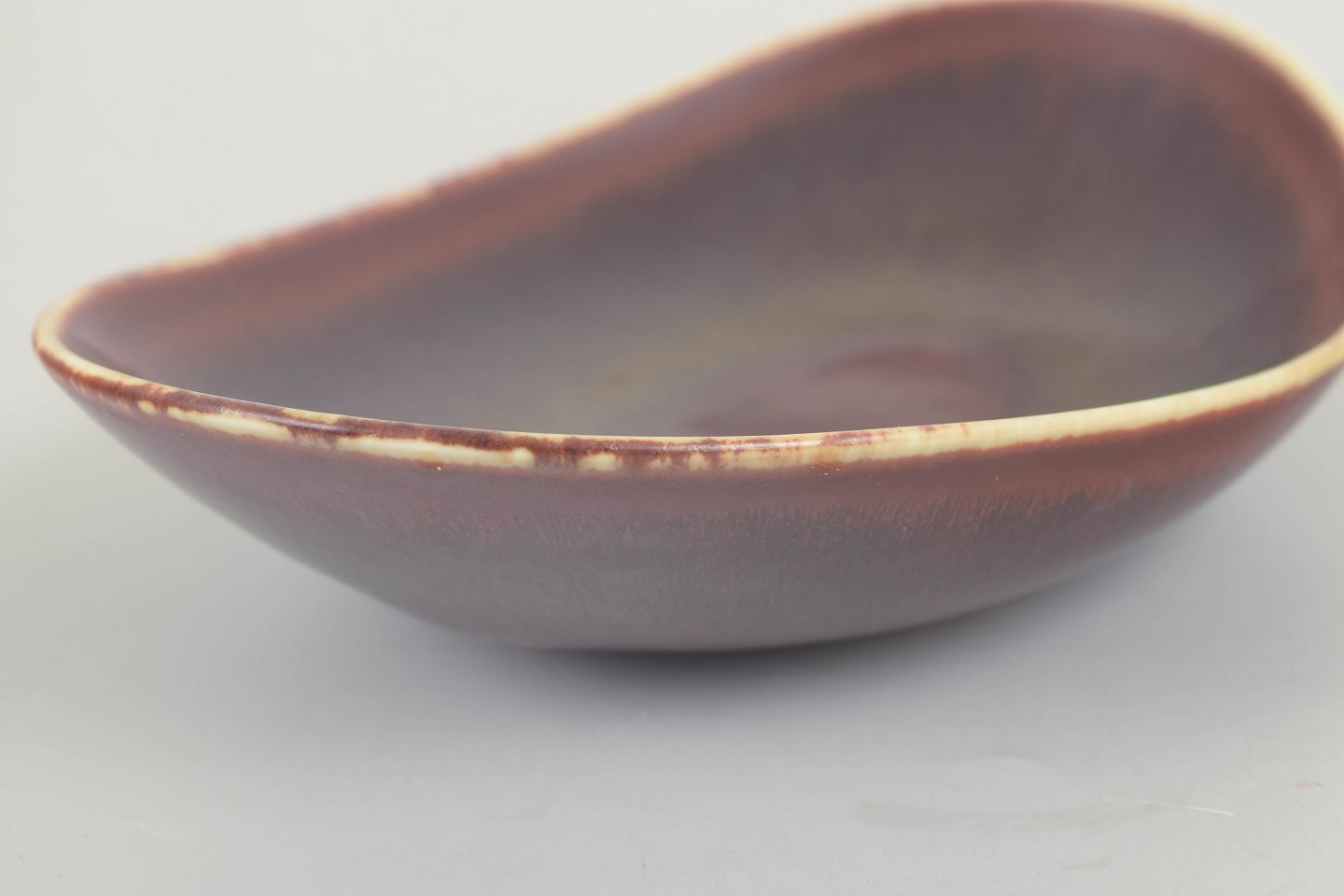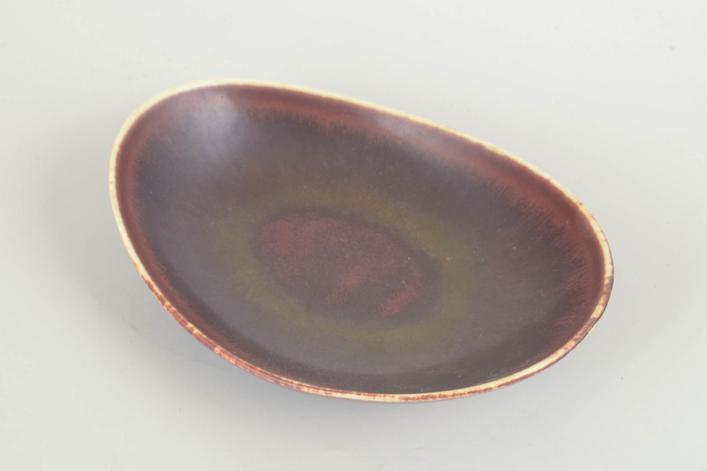 Asymmetrisk formet skål i stentøj med mat brunrød glasur med olivengrønne nuancer i midten og lys kant. Et fint eksempel på Stålhane’s sans for skulpturel balance og afdæmpet farvespil.