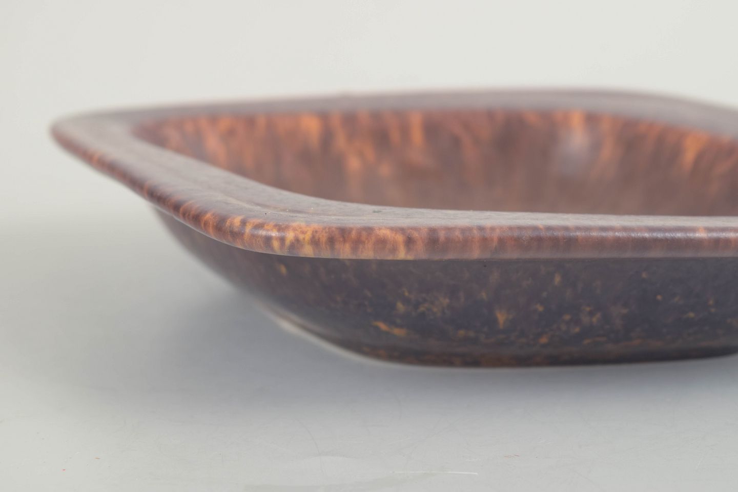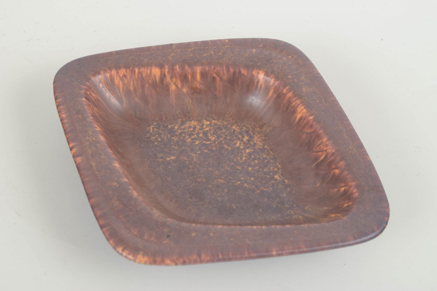 Lav, firkantet skål i stentøj med let buede sider og glasur i brunrøde nuancer med levende spil og løbende effekt. En karakteristisk form og glasur fra Nylunds mid-century produktion for Rörstrand, hvor funktion og æstetik forenes i et skulpturelt udtryk.