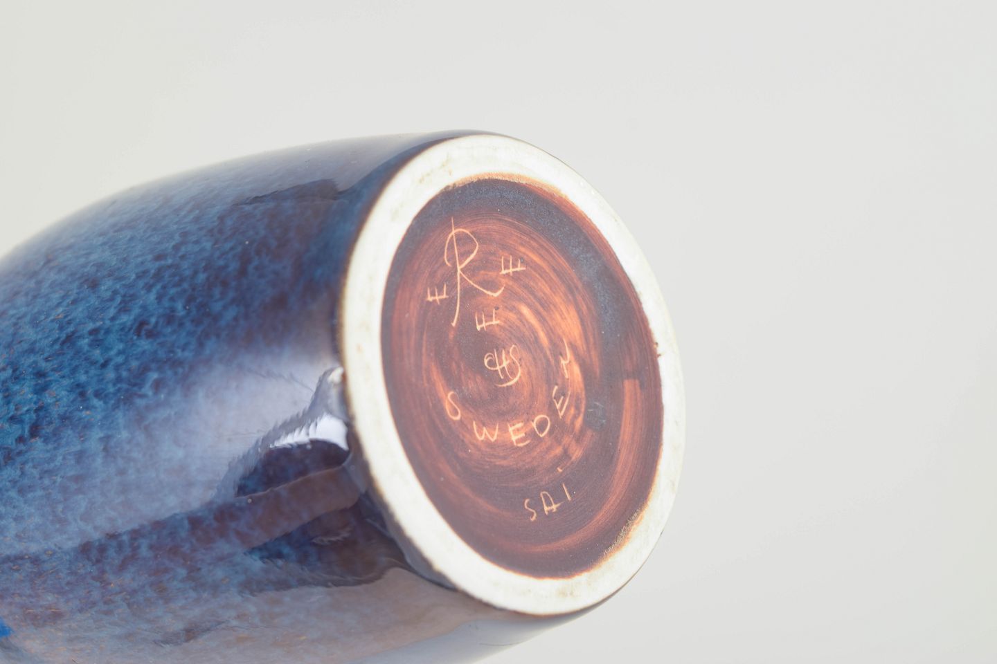 Slank, dråbeformet vase i stentøj med glansfuld blå glasur i levende nuancer fra dyb kobalt til lysere blå toner. Den elegante, organiske form og den fine glasurforløb er karakteristisk for Stålhane’s arbejde i 1950’erne og 60’erne.