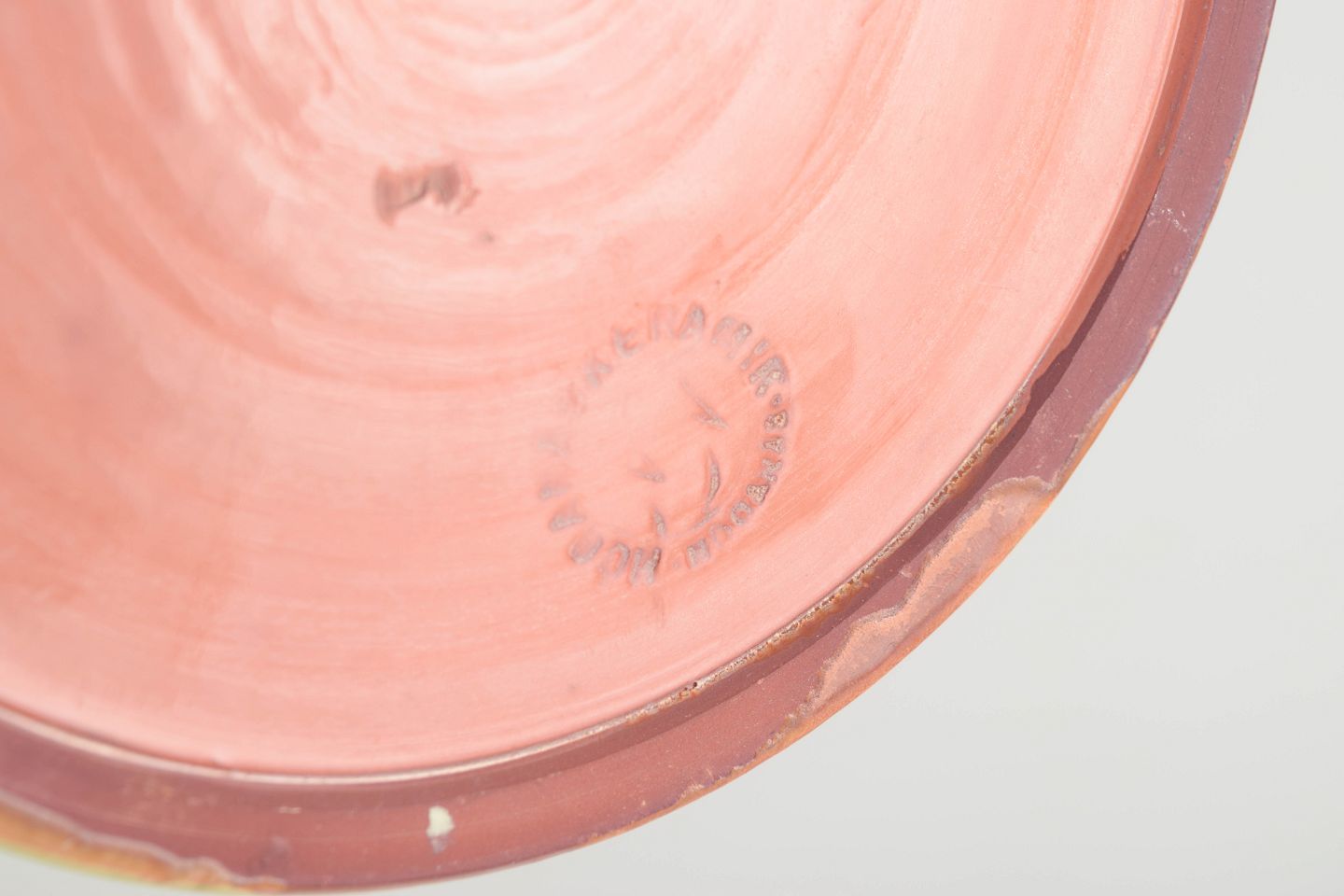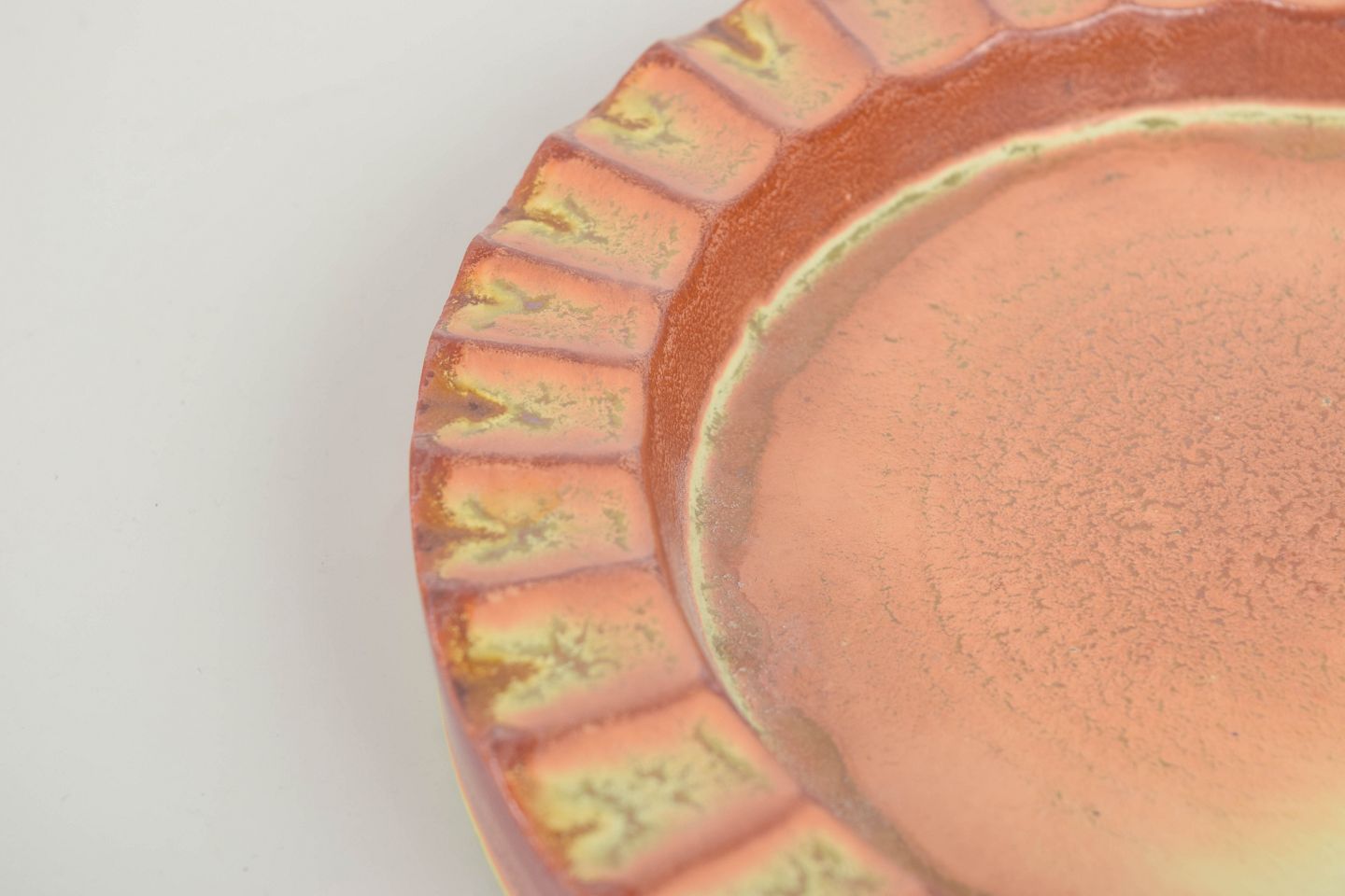 Lavt, cirkulært keramikfad med karakteristisk reliefkant og glasur i rosa, grønne og gyldne toner. Et smukt eksempel på svensk Art Deco-keramik fra Höganäs, hvor dekorativ formgivning og eksperimenterende glasurer blev kombineret i funktionelle hverdagsobjekter.