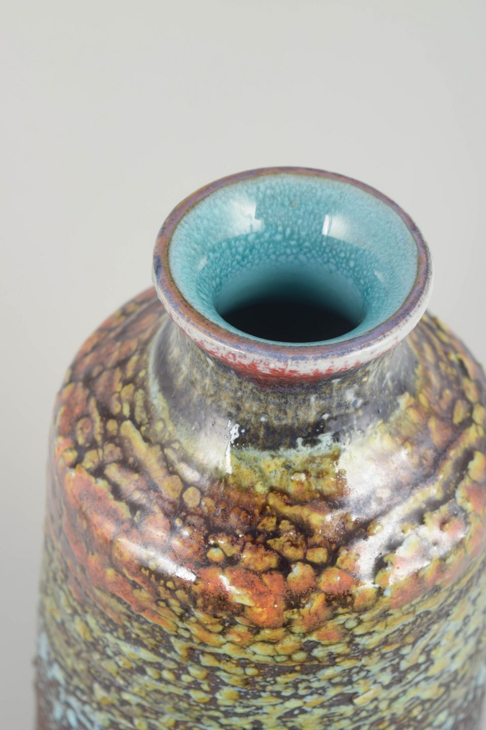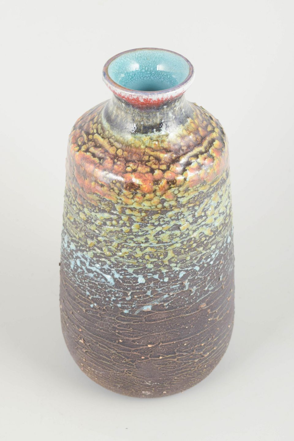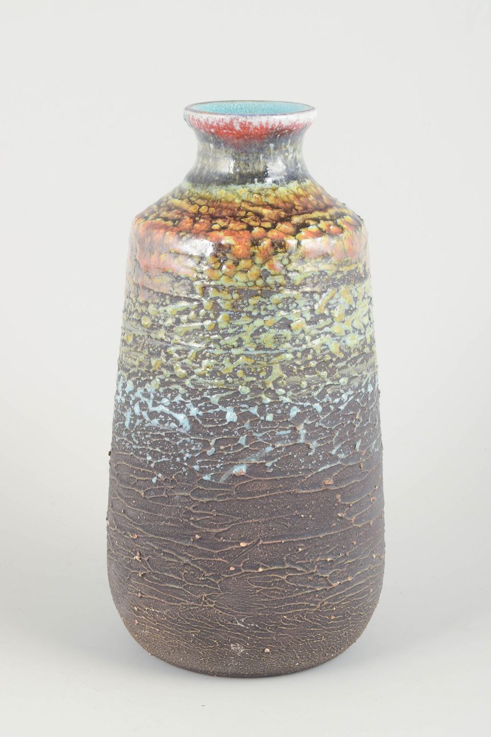 Stor håndlavet vase i chamotte-ler med karakteristisk vulkansk glasur i flerfarvede nuancer af brun, grøn, blå og rød. Den kraftige tekstur og de flydende farveovergange giver vasen et levende og organisk udtryk, typisk for Tilgmans eksperimenterende keramik fra perioden.