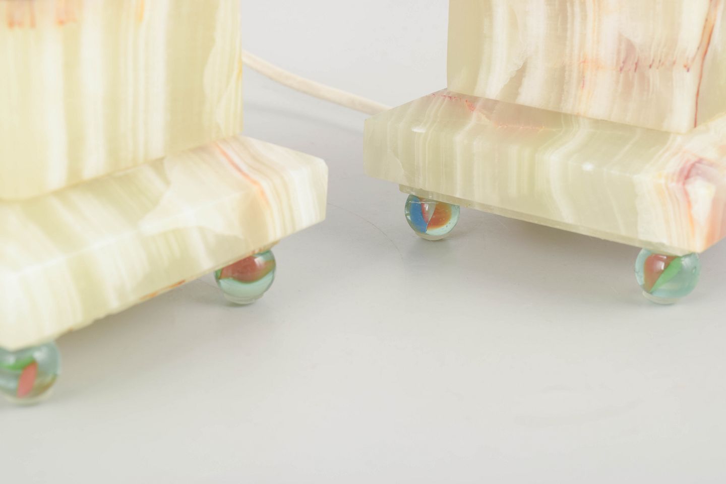 Elegant par bordlamper i poleret onyx med naturlige årer i grønne, rosa og cremefarvede toner. Fod og top i messingdetaljer, monteret på små kugleben i glas. Klassisk italiensk design med tydelig reference til Volterras stenhuggertradition.