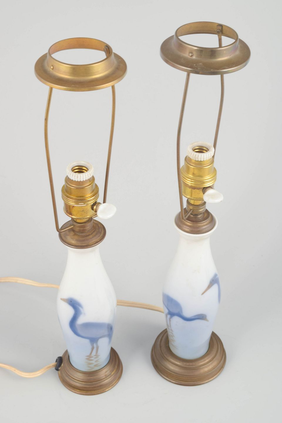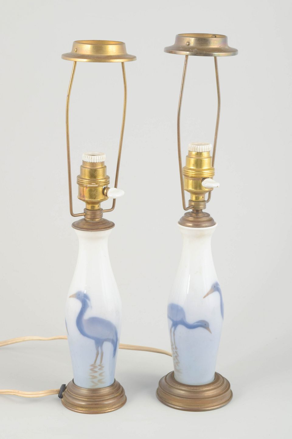 Et par elegante bordlamper med håndmalede motiver af hejrer i blå toner på hvidt porcelæn, monteret med originale fatninger og detaljer i patineret messing. Klassisk design med tidlig 1900-tals æstetik.