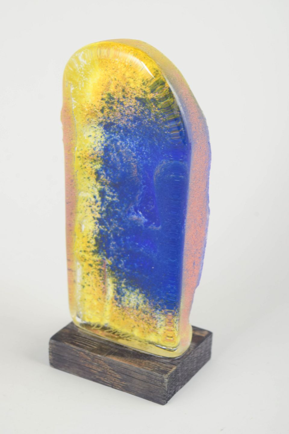 Svensk glaskunstskulptur med ansigtsmotiv i blå, gule og orange nuancer. Udført i støbt glas med en mat, krystallinsk overflade og monteret på sort træfod.